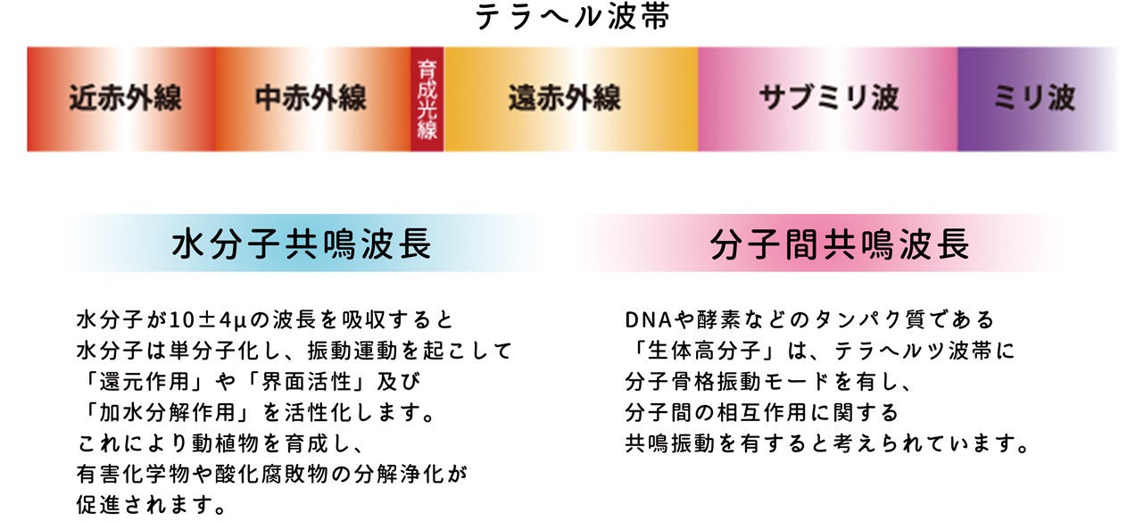 テラヘルツ派帯の遠赤外線領域には育成光線が含まれ、水分子や細胞の活性など効果が期待できます。