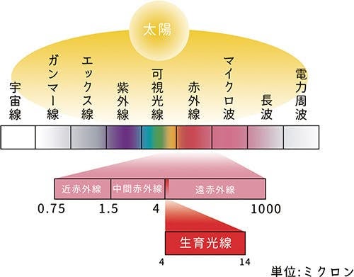 太陽光線の中に含まれる遠赤外線の中でも。特に生物にとって有効に働きかける波長をもつものを育成光線。または健康光線と呼んでいます。その波長は、およそ6~14ミクロンで私たちの体も同じような波長の育成光線を放射しているといわれています。
