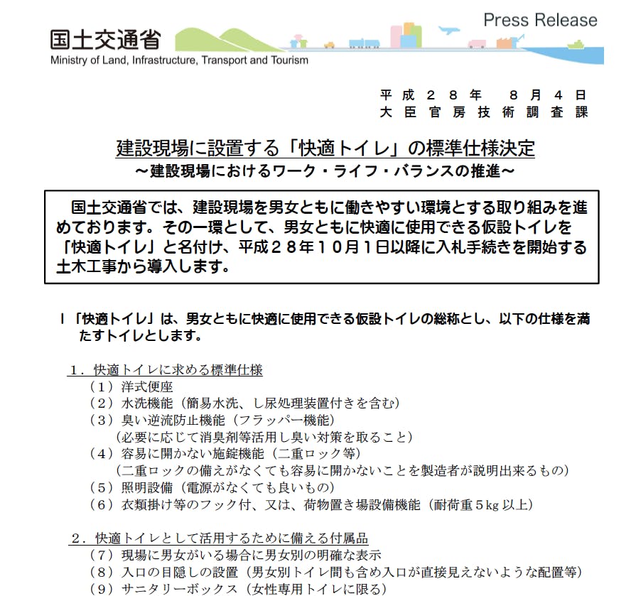そんな想いを親しい人に語っていたところ、なんと、国土交通省が定める「快適トイレ」の基準づくりに参画するチャンスがめぐってきたのです。