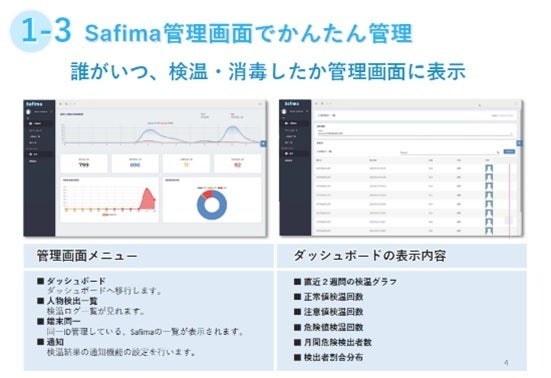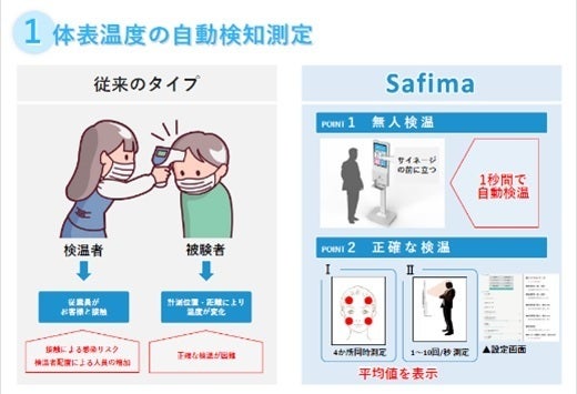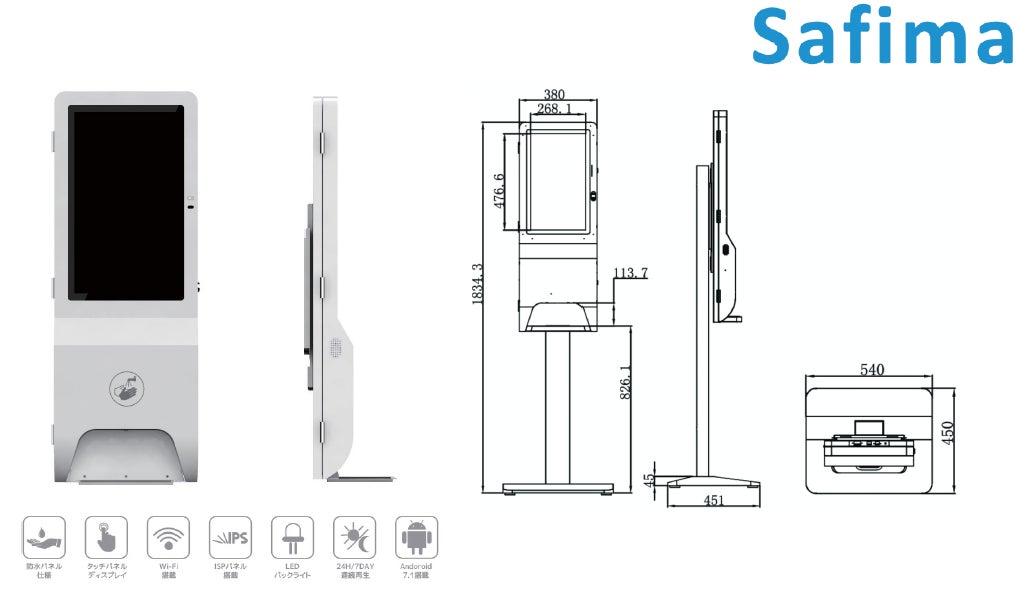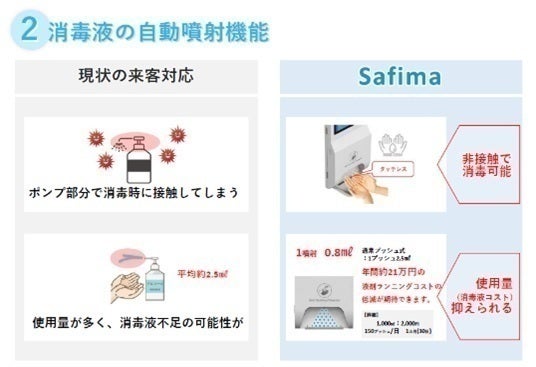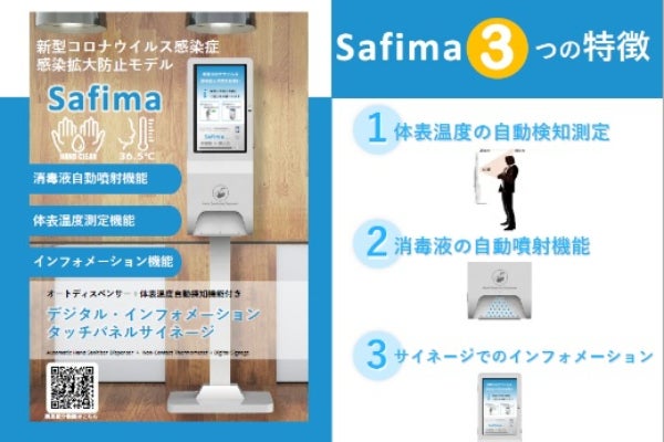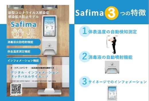 Safimaは消毒液自動噴射機能、体表温度測定機能、インフォメーション機能を有した