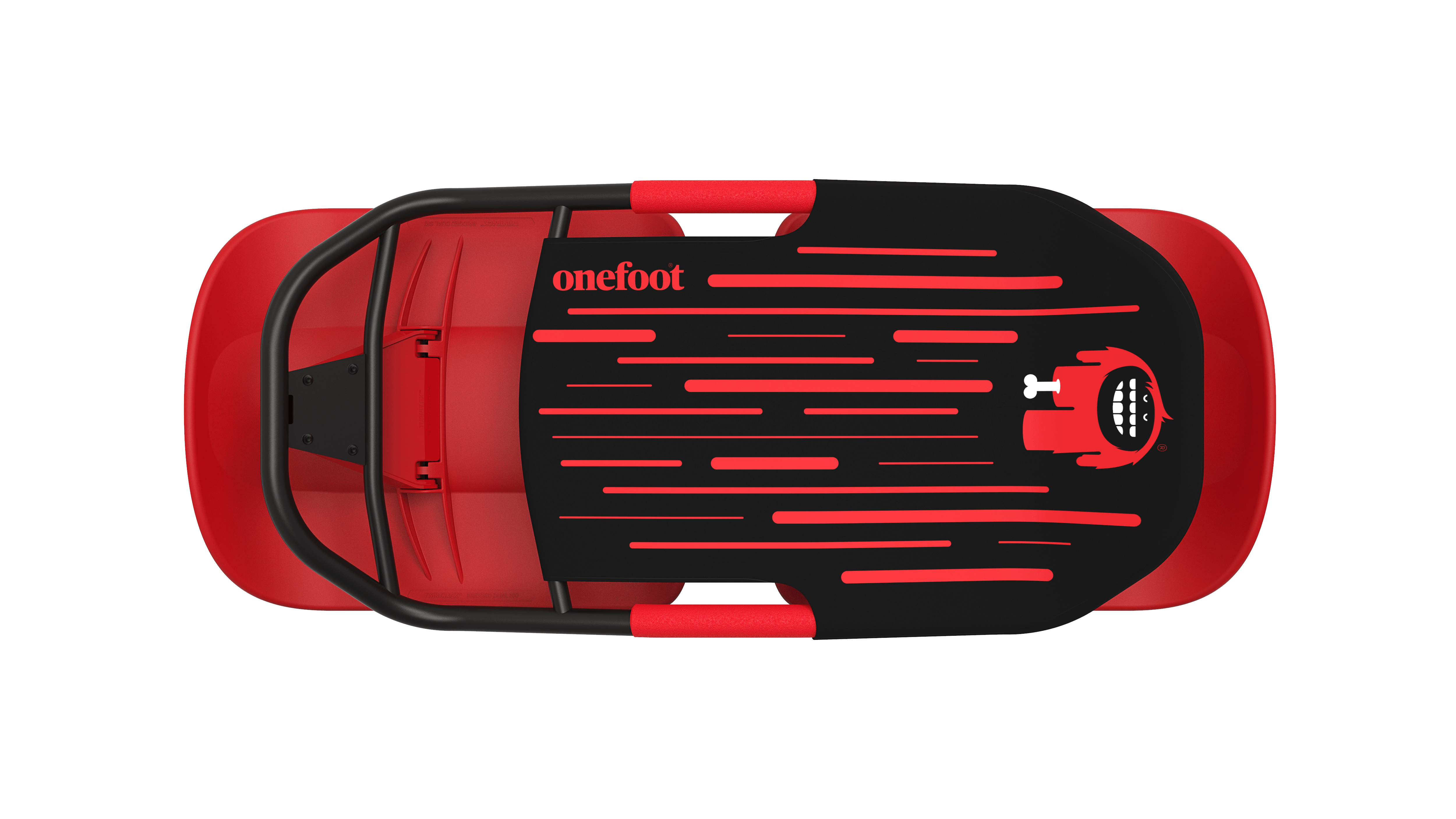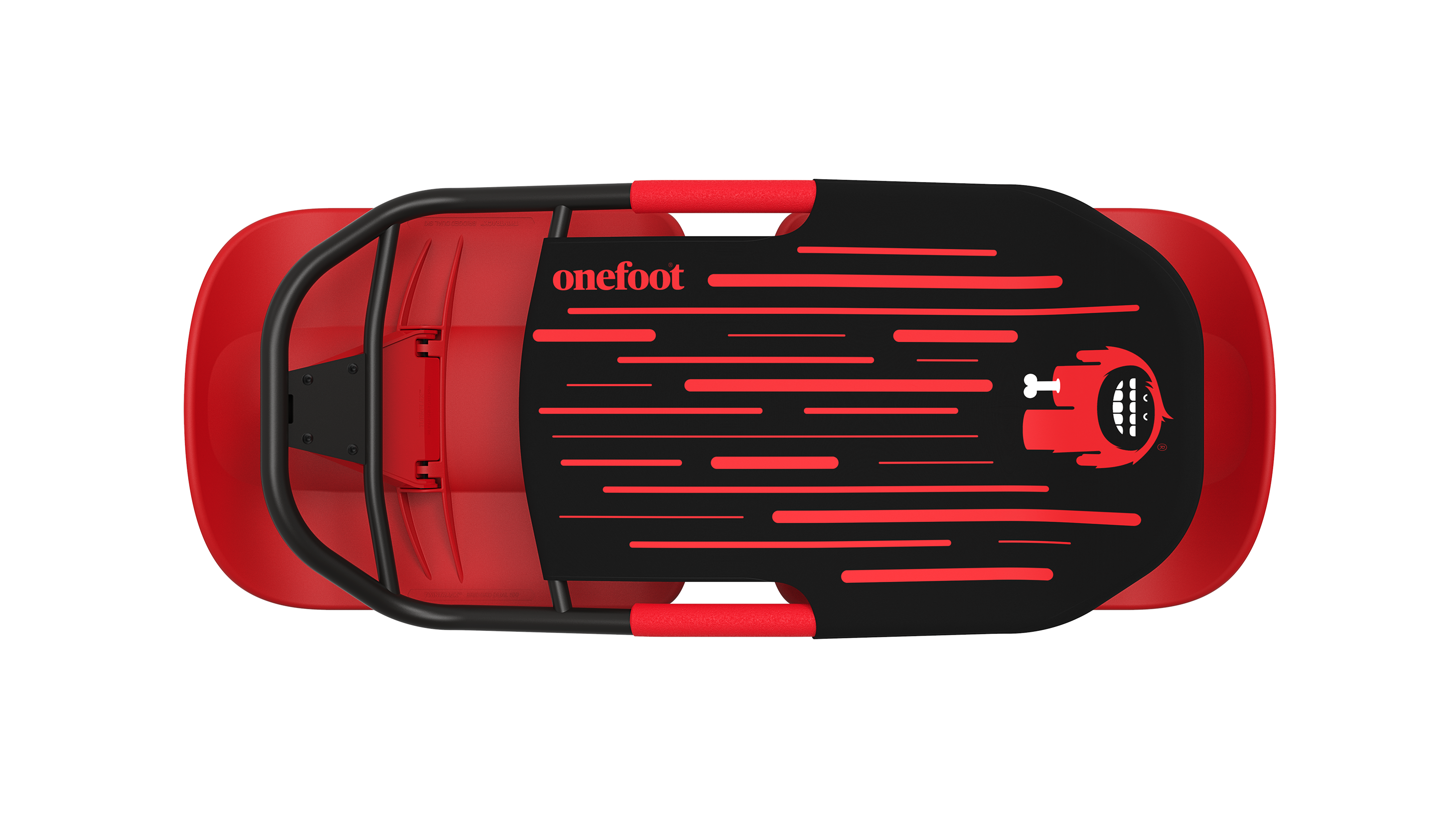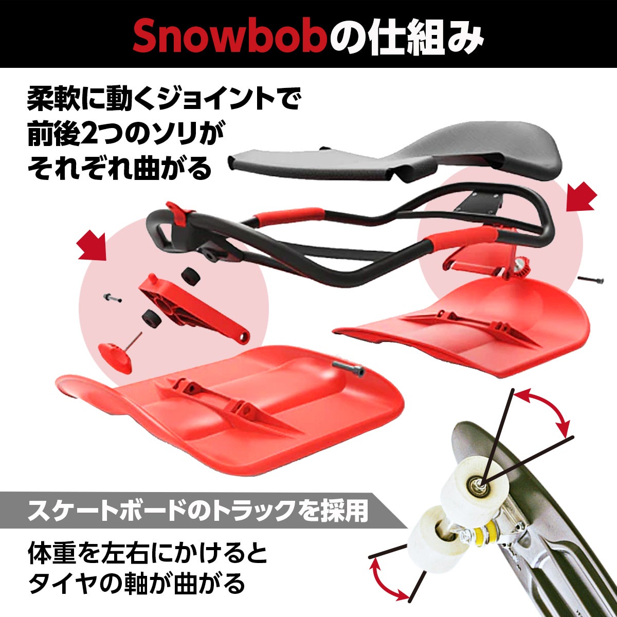 A1.スケートボードのタイヤの付いた軸(トラック)が前後に2つあります。この軸はスケートボードを傾けるとタイヤの進行方向が曲がる仕組みになっています。SnowBobはこの前後独立の舵をとる構造を、タイヤの代わりに2つのソリで舵をとれるようデザインしました。