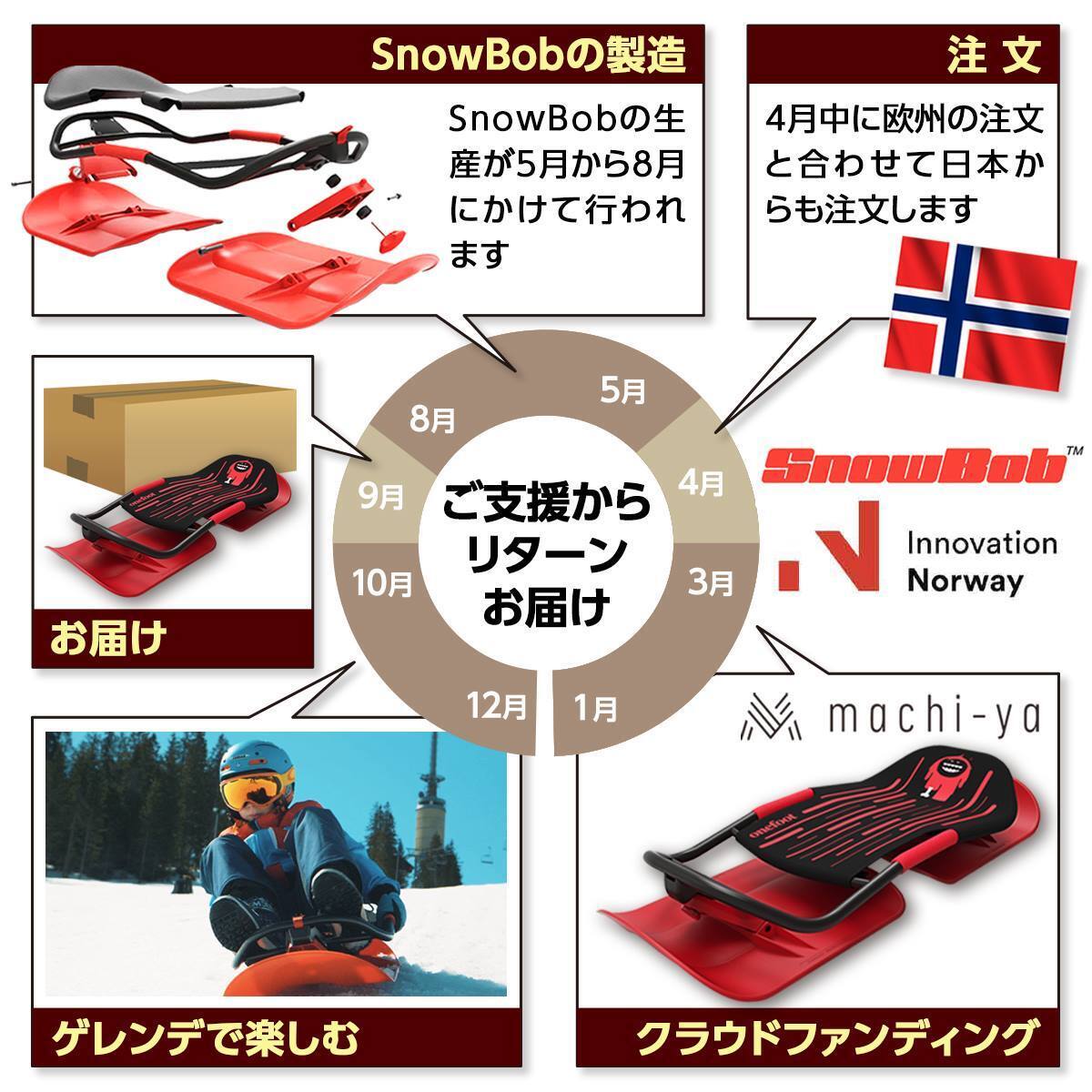 最初の製品ワンフットミニスキーが2012年秋に発売されると、我々の新しいミニスキーの革新的な発想はすぐに認められました。この製品は我々のOnefoot.comのみで発売されましたが、発売後数か月でノルウェーの人気クリスマスプレゼントとなりました。これを知ったノルウェーの小売業者はこぞって取り扱いを始めた状況でした。現在までに約70.000台販売されています。 このワンフットミニスキーを手がけたチームが、今回新たに「SnowBob」を世界に紹介することで、ビジネスがさらに広がることを楽しみにしています。