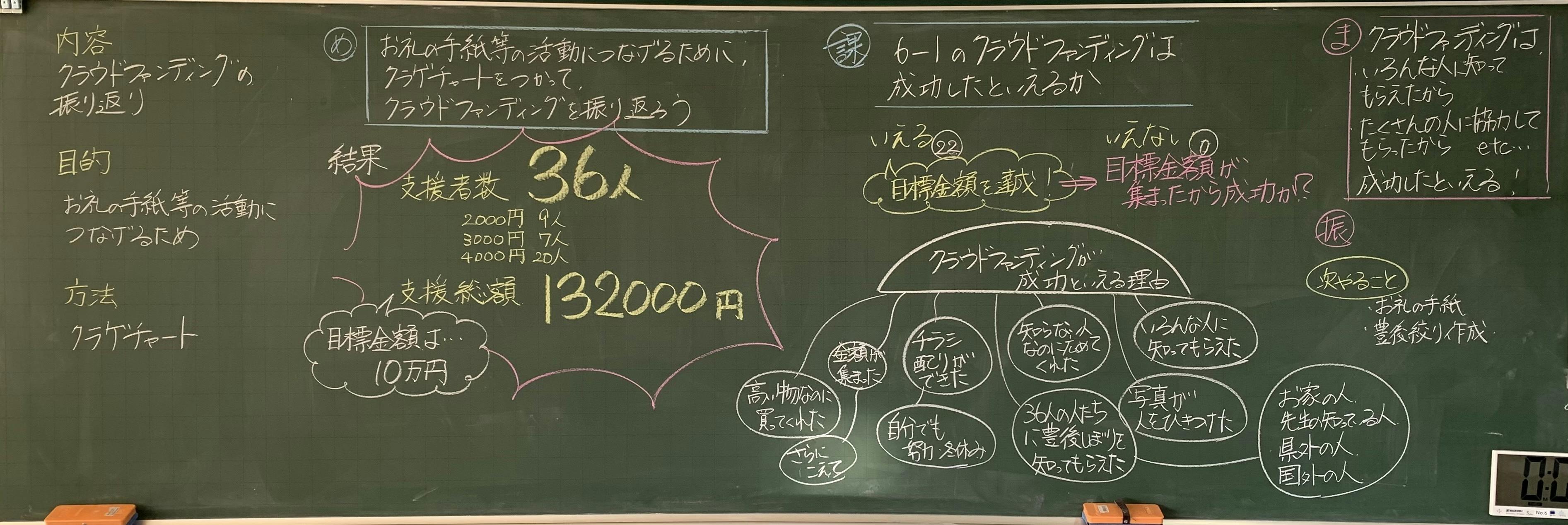2021/01/18 10:25みなさまのご支援のおかげで、本プロジェクトは目標を達成することができました。大変ありがとうございました。本校では大雪のために臨時休業が続き、1月13日に始業式を行いました。登校するなり子どもたちは、口々に目標が達成できたことを話題にし、喜び合っていました。本日、授業でクラウドファンディングについて振り返りました。「クラウドファンディングは成功したといえるか」という課題のもと話し合い、「お金が集まったから成功なのか」と議論していきました。子どもたちは、「多くの人が協力してくれたから」「冬休みに自分たちでも努力できたから」等、寄付をいただいたことだけでなく、多くの方の協力し支えていただいたこと、自分たちのこれまで重ねてきた努力や工夫に等に目を向け、達成感を味わう姿が見られました。授業の振り返りには、「お金が集まったから成功じゃなくて、多くの支援者の方のおかげで成功したのだと思います。多くの意見が出てきて、このような理由がたくさんあって成功したんだと思うと、うれしくなります」「たくさんの人に知ってもらえてよかったです。冬休みの間も自分でチラシを配ってたくさんの人に知ってもらえたと思います。クラウドファンディングをやってよかったです」「たくさんの人が応援してくれたので、それに応えるために、僕らも必死に試行錯誤していこうと思います」等の記述がありました。これから、お礼のお手紙や豊後絞りのハンカチの作成を進めてまいります。どうぞ、引き続きご支援のほどよろしくお願いいたします。 もっと見る国東市立図書館,国東市教育委員会に協力のお願いにうかがいました!