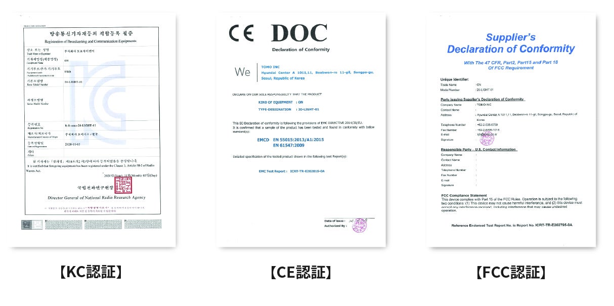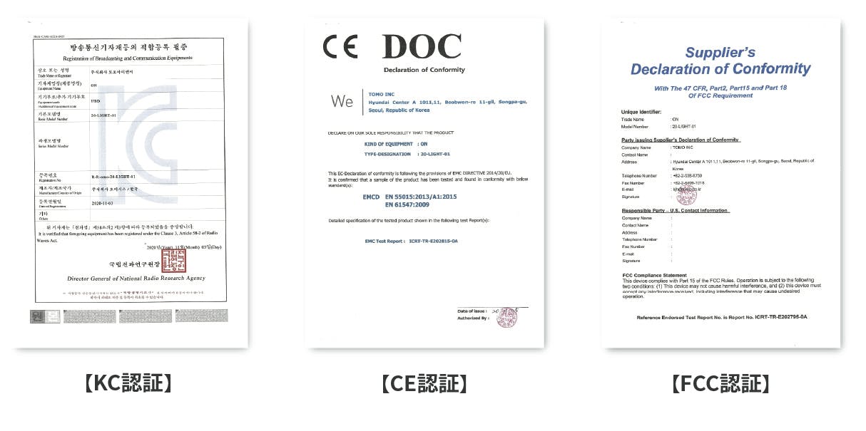 アメリカ、ヨーロッパ、韓国の電磁波適合認証を獲得しました。 日本PSE【電気用品安全法適合性証明】に準ずる認証で、製品の品質と安全性が認められました。