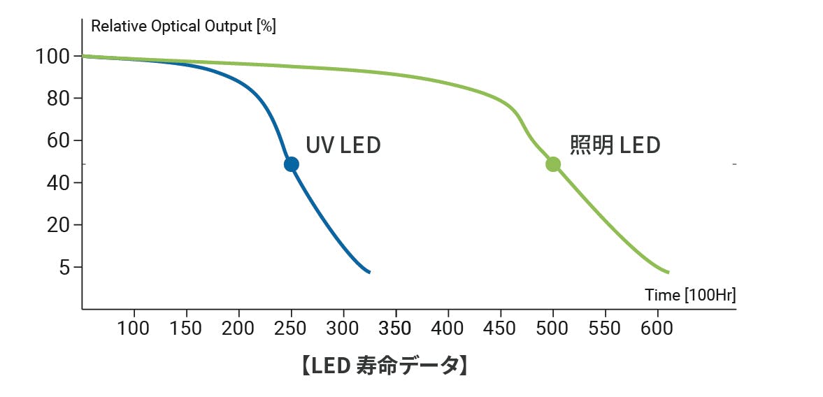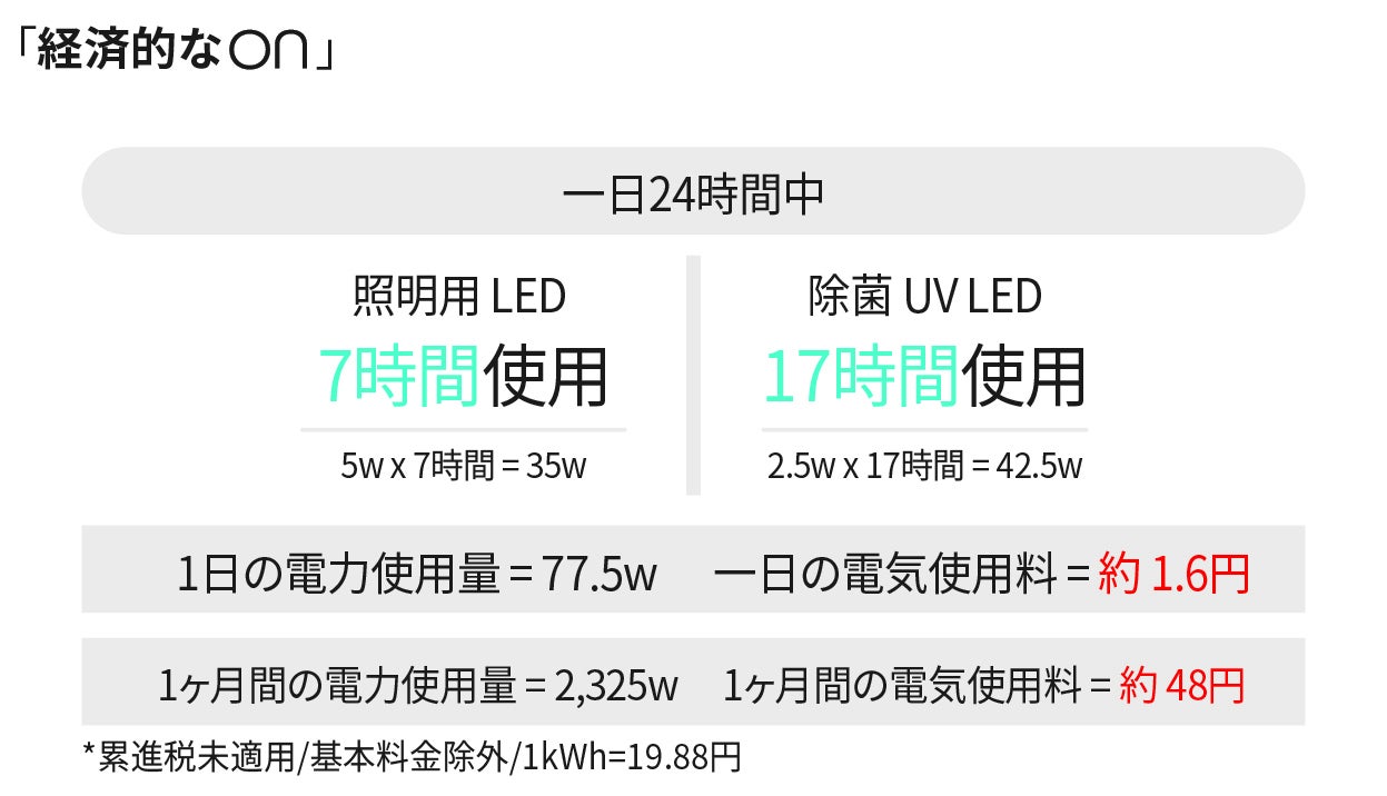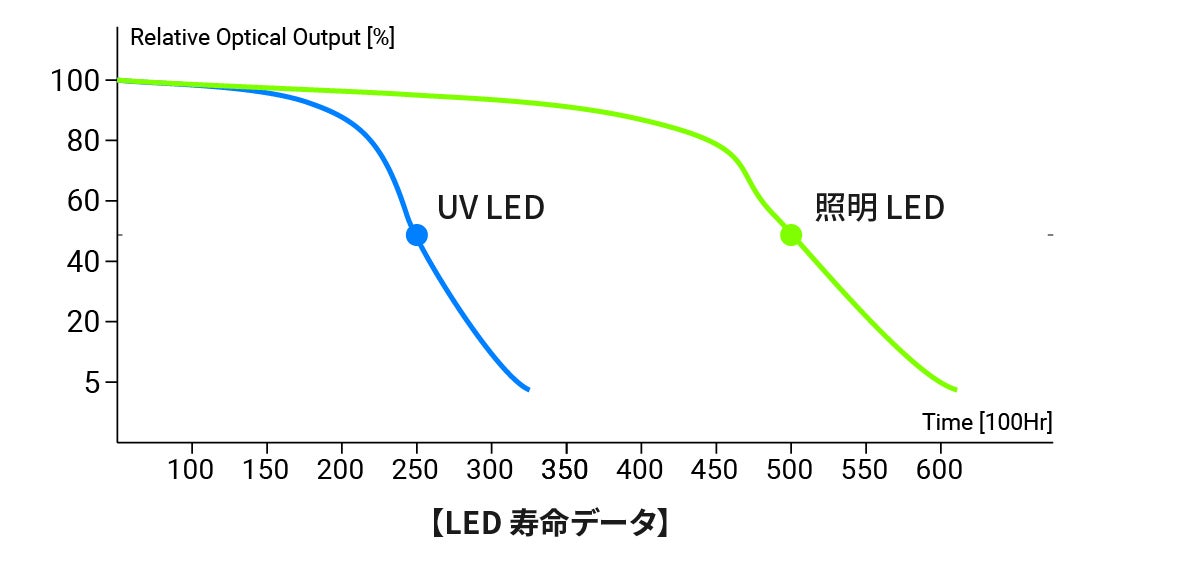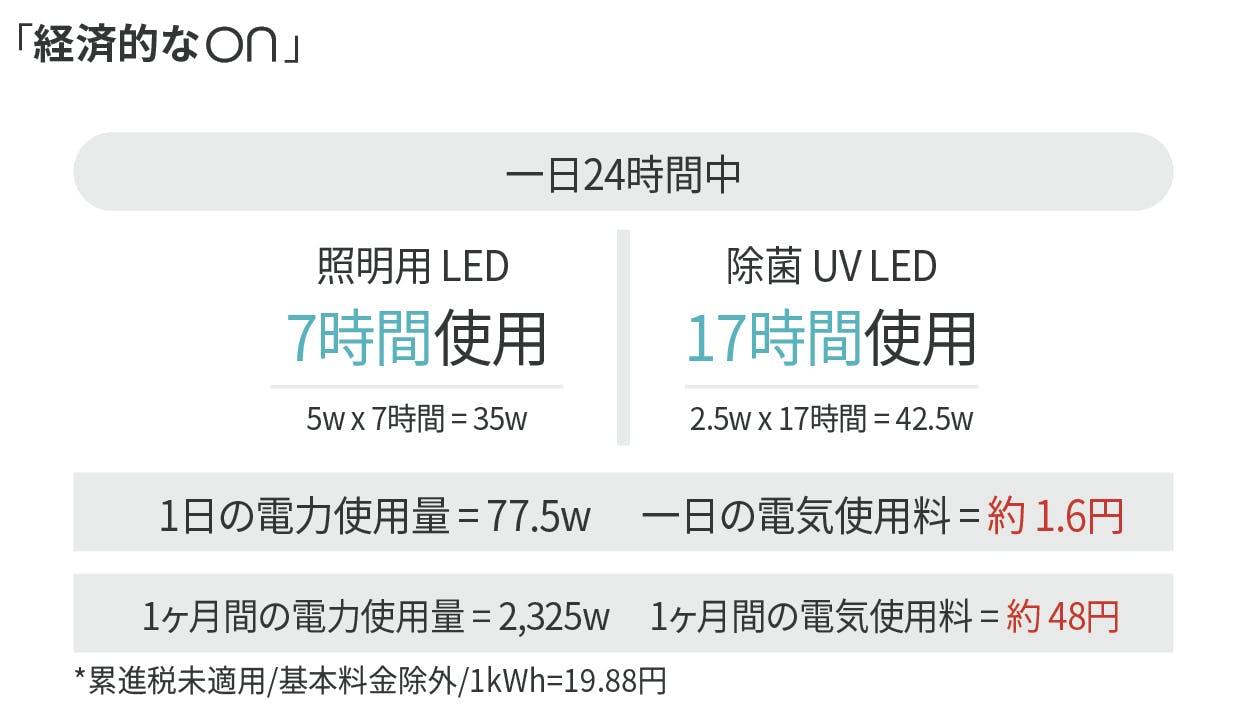 製品についている照明用LEDは5万時間、UV-C LEDは25,000時間です。 24時間連続使用の場合、8年以上使用可能です。
