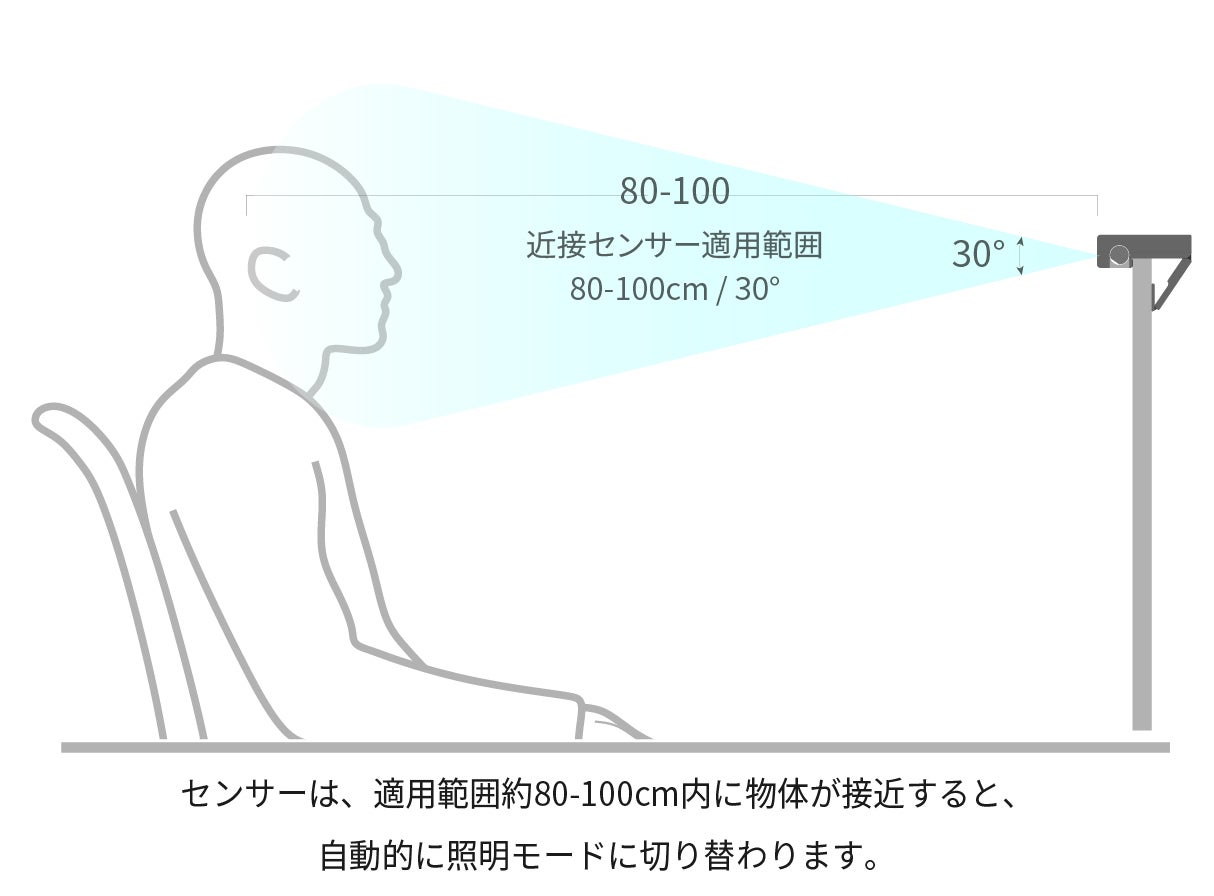 使用者がセンサー領域で感知されると、直ちに照明モードに切り替わります。
