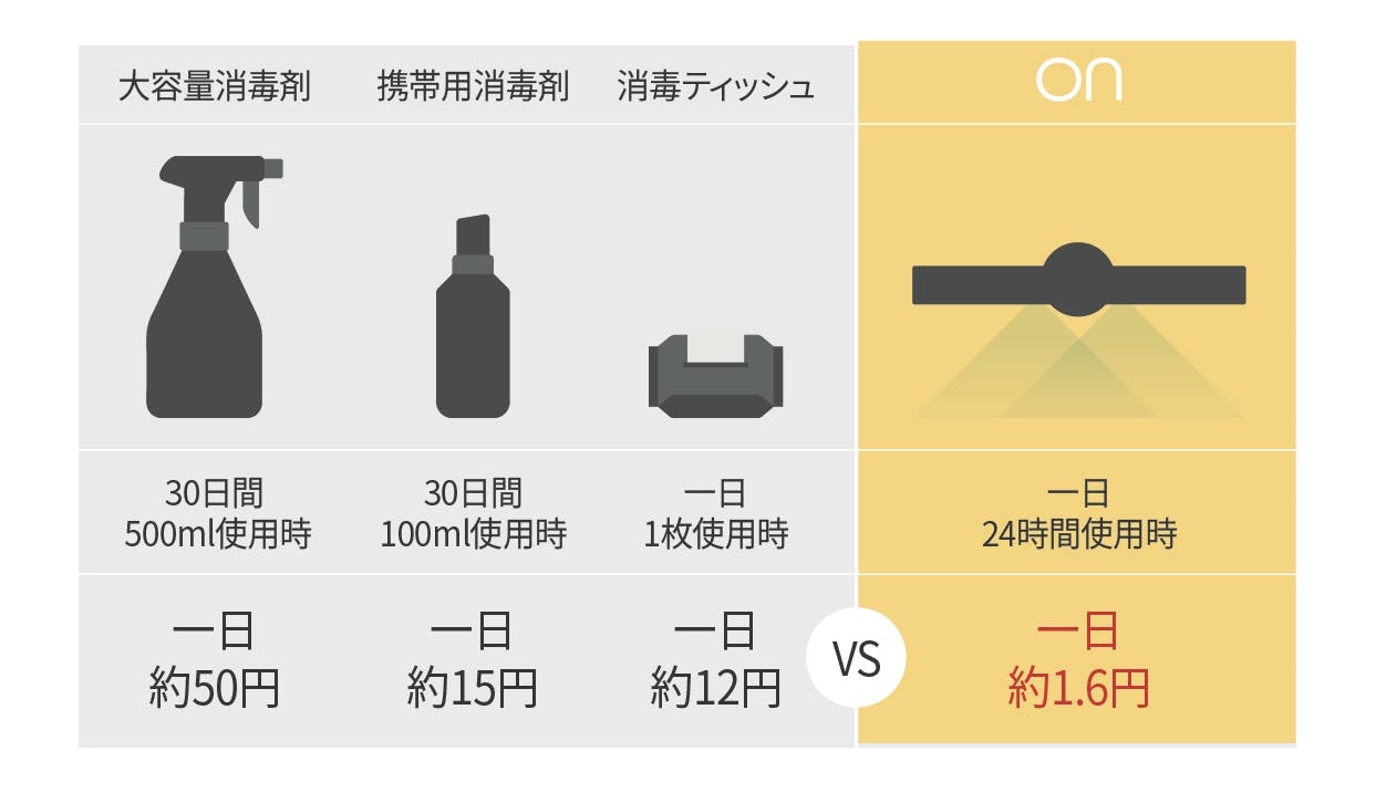 「ON」は、UV-C波長だけで生活空間を除菌するため、除菌剤や使い捨ての除菌ティッシュの使用を減らし、経済的で環境に優しい製品です。