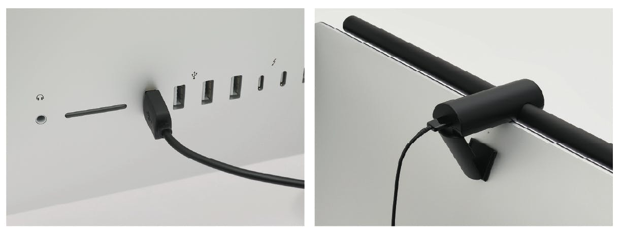 モニターに引っ掛けるだけの簡単取り付け!給電はUSBから行います。