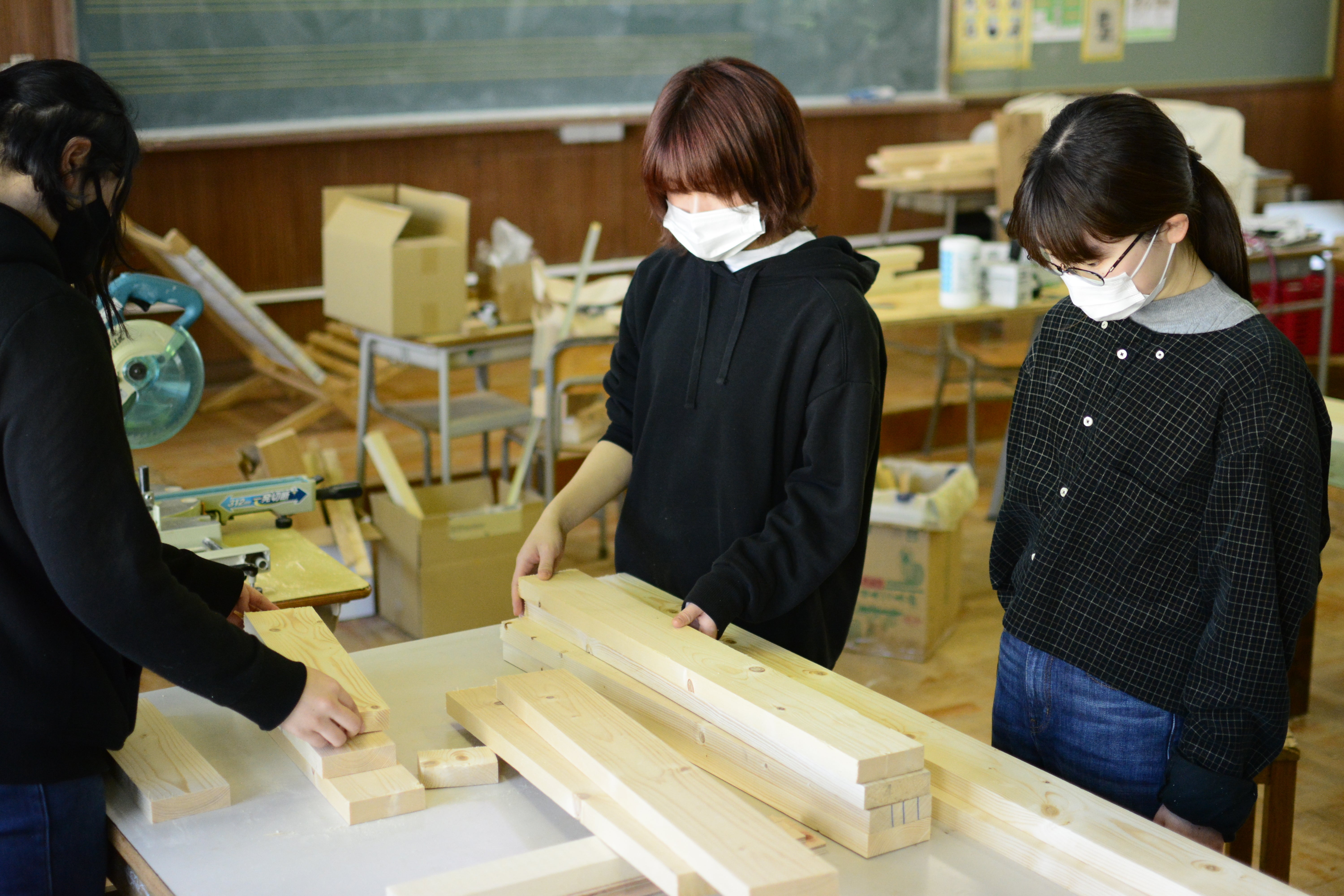 廃校の中には「木育教室」があり、木の専門家がいるので、一緒に制作をしています~!