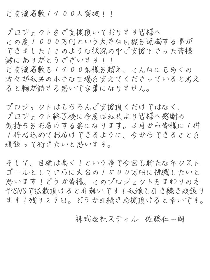 本日1200万円達成致しましたのでご報告させて頂きます。ご支援くださった方々もなんと1700人にまでなりました!本当にありがとうございます!!現在私達は、リターン品をお届けした際皆様に美味しくお召し上がり頂けるように、レシピの作成などに取り組んでおります。沢山ご支援を頂いている中で私達にできる事は皆様に美味しいお肉をお届けし、食べて頂く事。限られた事ではありますが、その中でもできる限りのことは何でもしてみようと思っています。皆様より頂くメッセージも一つ一つ拝見させて頂き、沢山参考にさせて頂いております。本当にありがとうございます。引続きネクストゴールに向けて頑張って行きたいと思いますので、どうぞよろしくお願い致します!