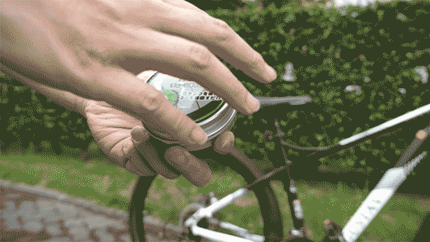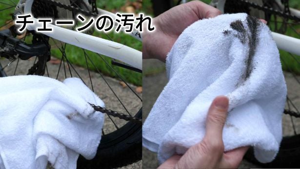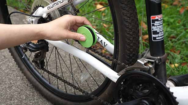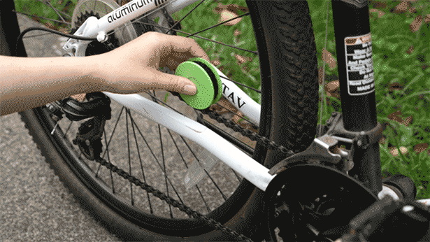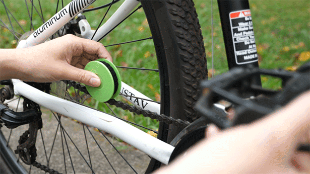 チェーンに押し付けてペダルを回すだけ。本当に簡単にチェーンのメンテナンスが完了します。