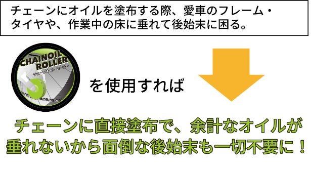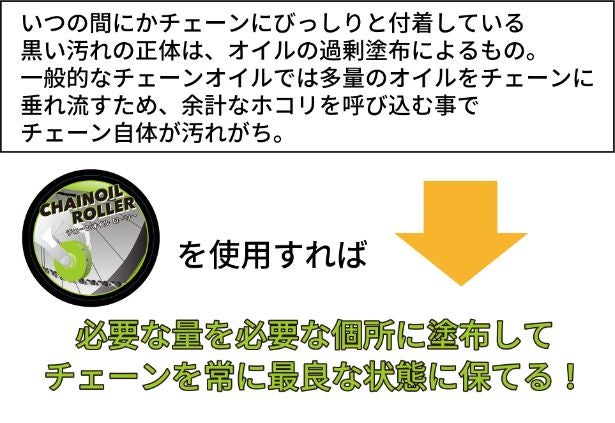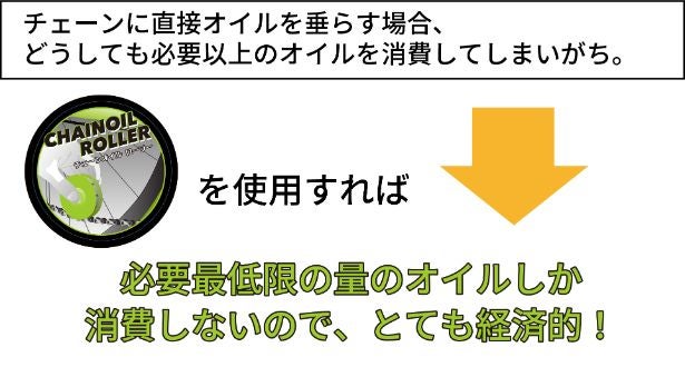 チェーンオイルの節約と環境保護の観点からも日々のメンテナンスでできる環境保護アイテムとしての「CHAIN OIL ROLLER(チェーンオイルローラー)」のご利用をご検討いただければ幸いです。