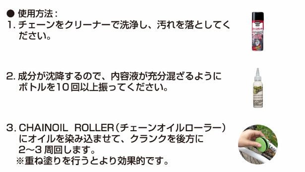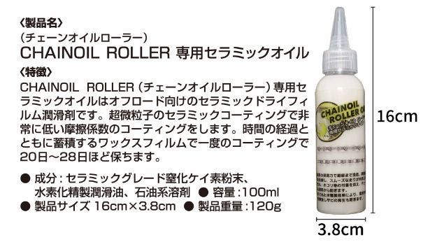 CHAIN OIL ROLLER専用オイルは、セラミックドライフィルム潤滑剤で、超微粒子の非常に低い摩擦係数のコーティングが可能です。
