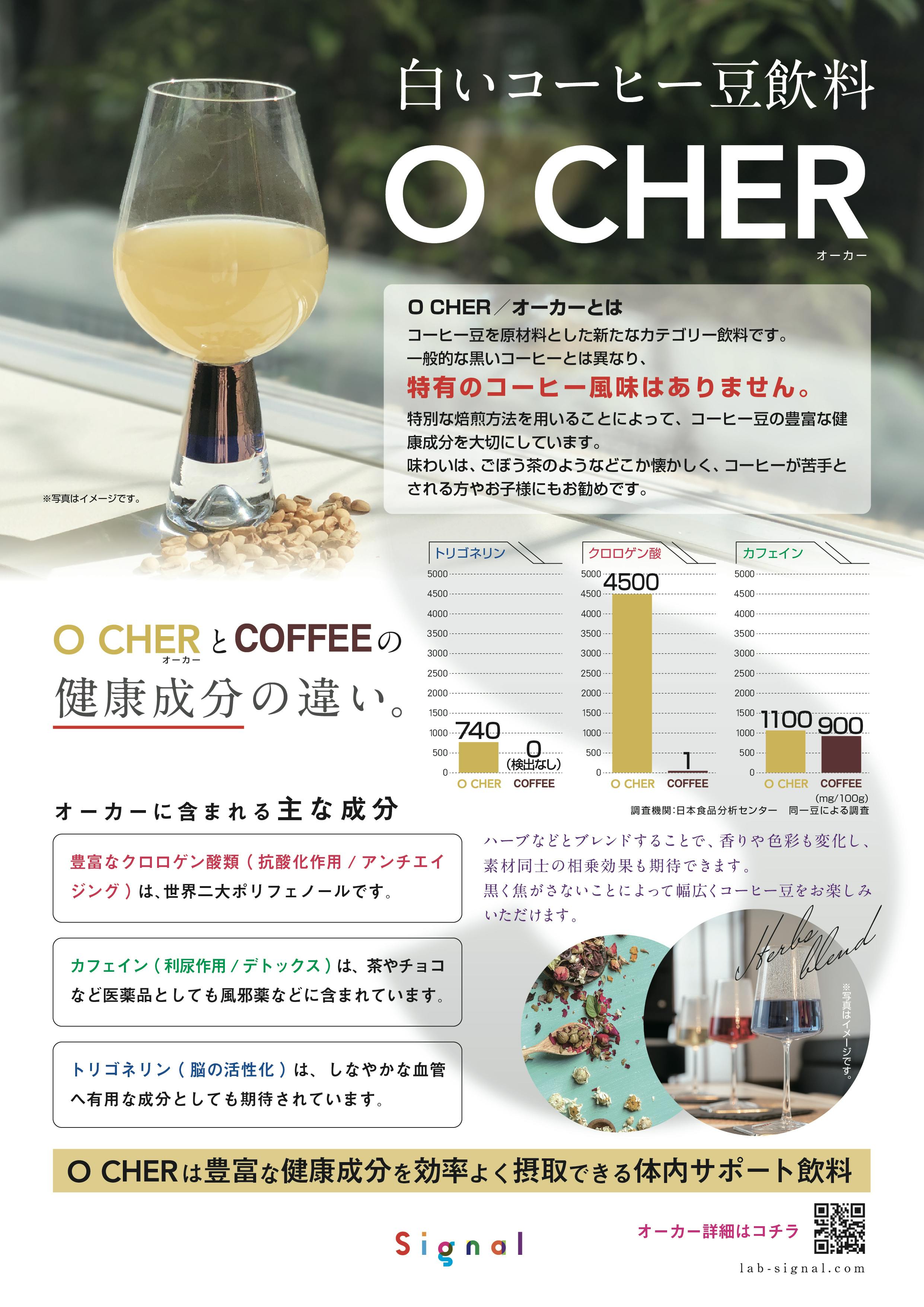 ・茶葉から用いた抽出液色を名称に、黄土色(ocher)を英語に変換しOは豆とイメージ、CHERがフランス語で高貴なという意味合いから豊富な健康成分を高貴な状態で提供したい。