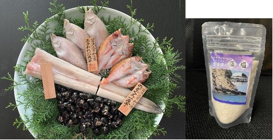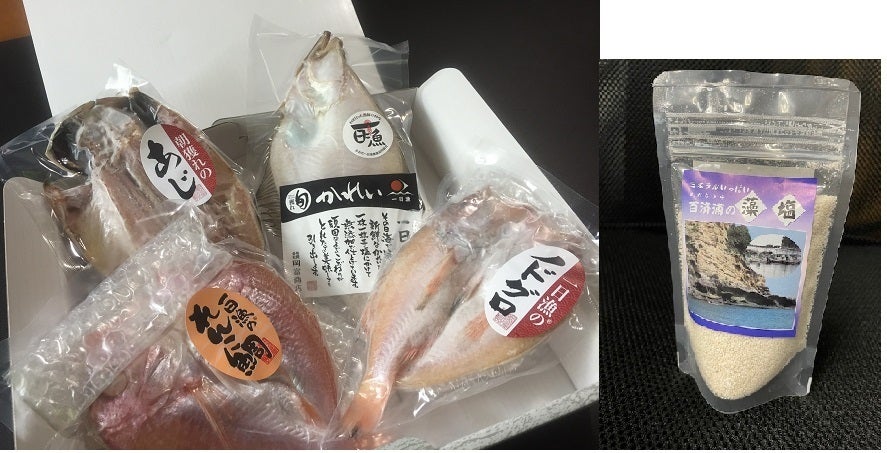 『百済浦の藻塩』100g入1袋と岡富商店ののどぐろ1尾、えてかれい1枚、あじ1尾、レンコ鯛1尾をセットにし、お礼のお手紙を添えてお送りします。