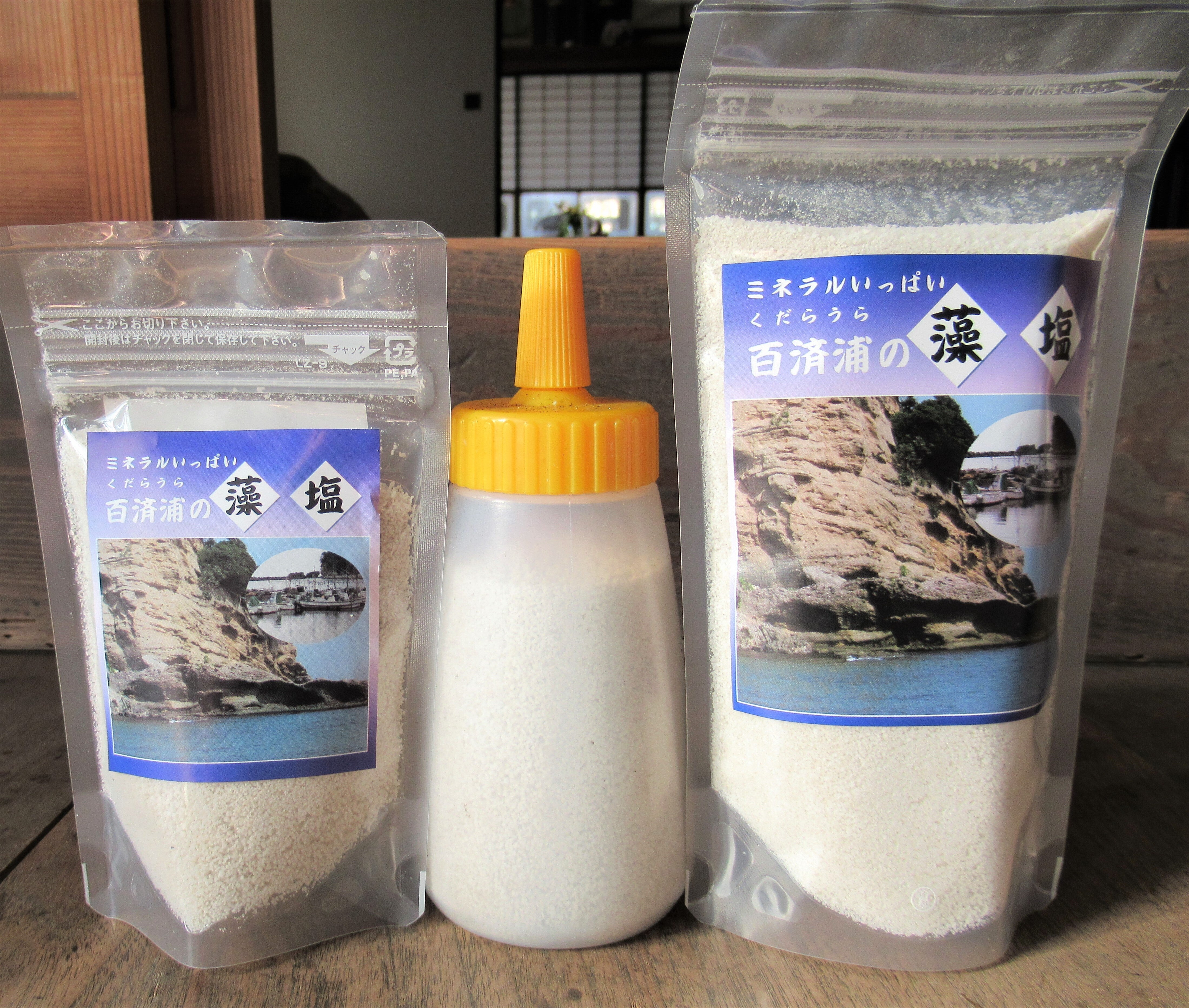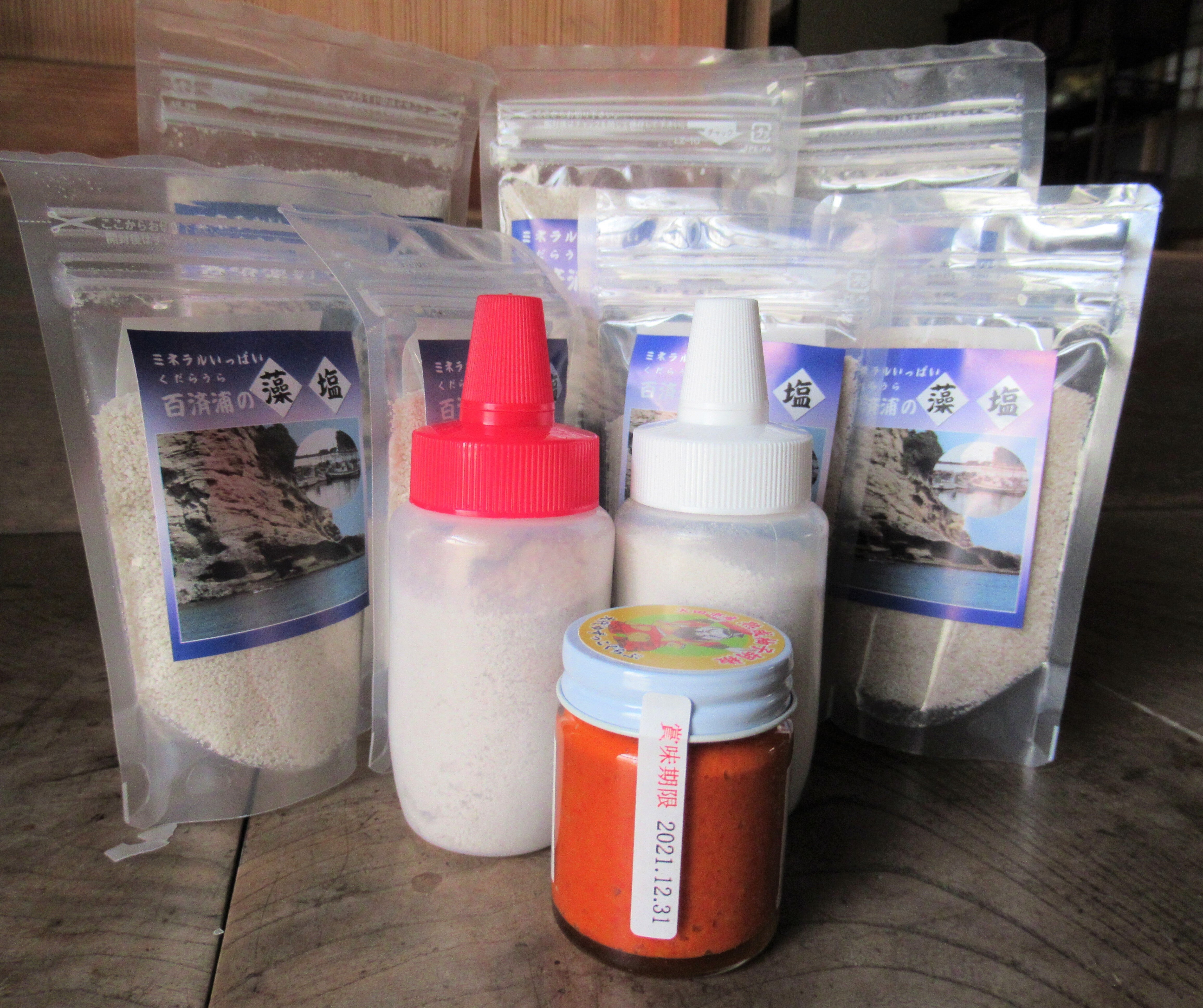 『百済浦の藻塩』藻塩200g入3袋・100g入4袋、卓上用100g入 2個、藻塩入り柚子胡椒1瓶とお礼のお手紙を添えてお送りします。