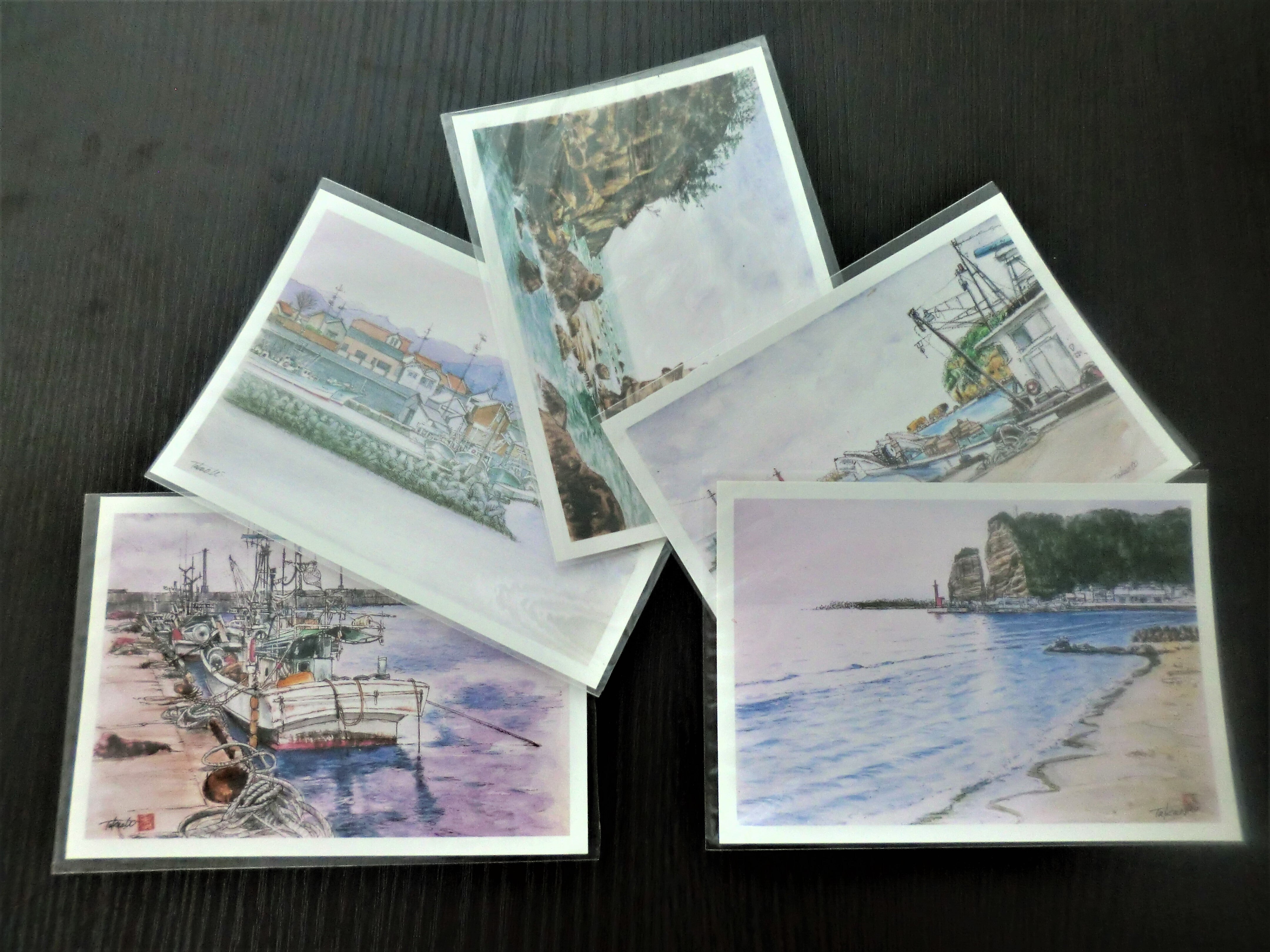 大田市出身の和田孝夫さんが描いた百済浦周辺の海岸風景のポストカード5枚セットにして、お礼のお手紙を添えてお送りします。