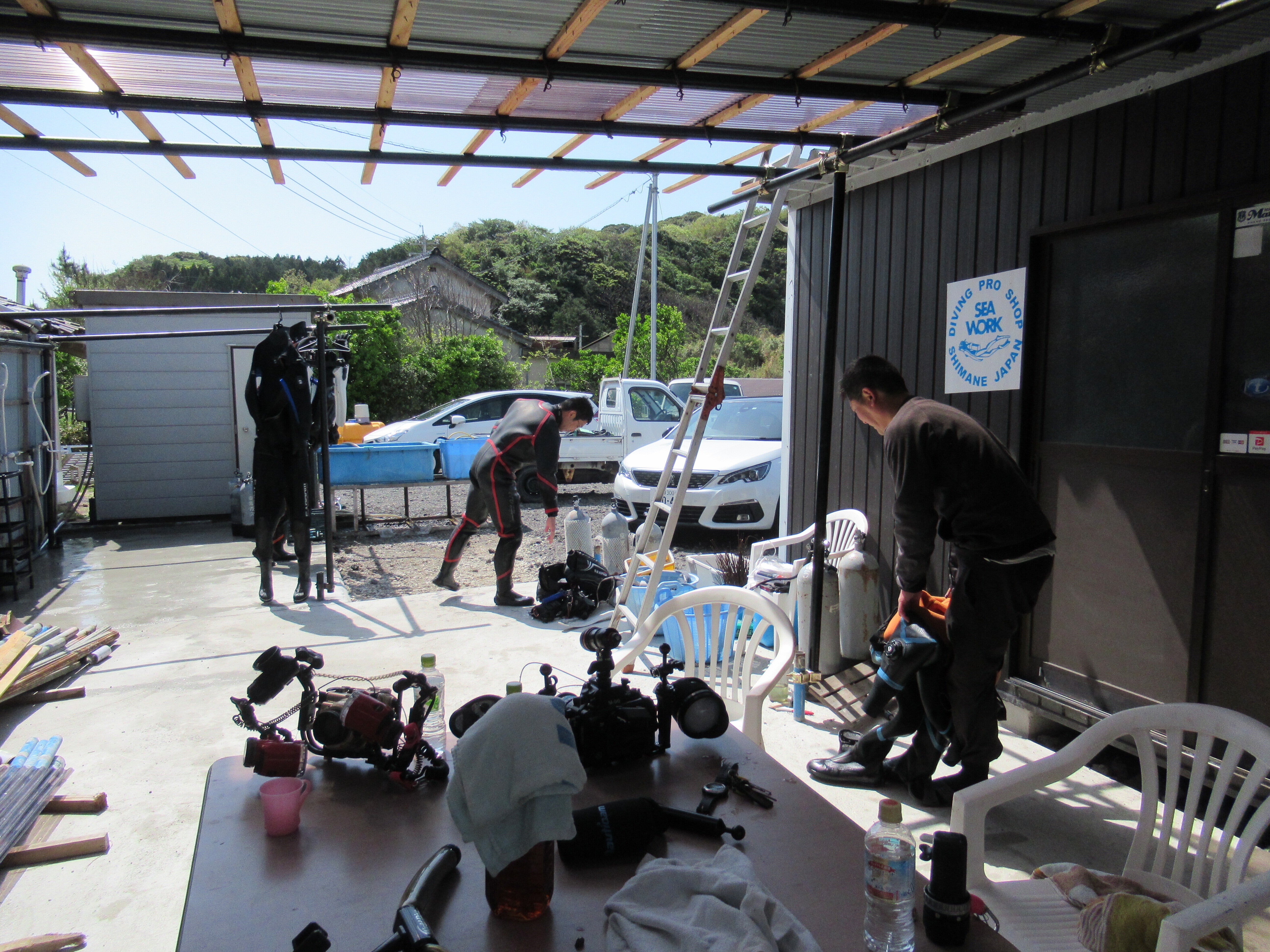 塩焚小屋のお隣にこの春引っ越してきたシーワーク。遠来のダイバーで賑わっています。塩焚小屋を覗いては、興味津々の様子。たくさんの方に興味を持っていただけると嬉しいです。
