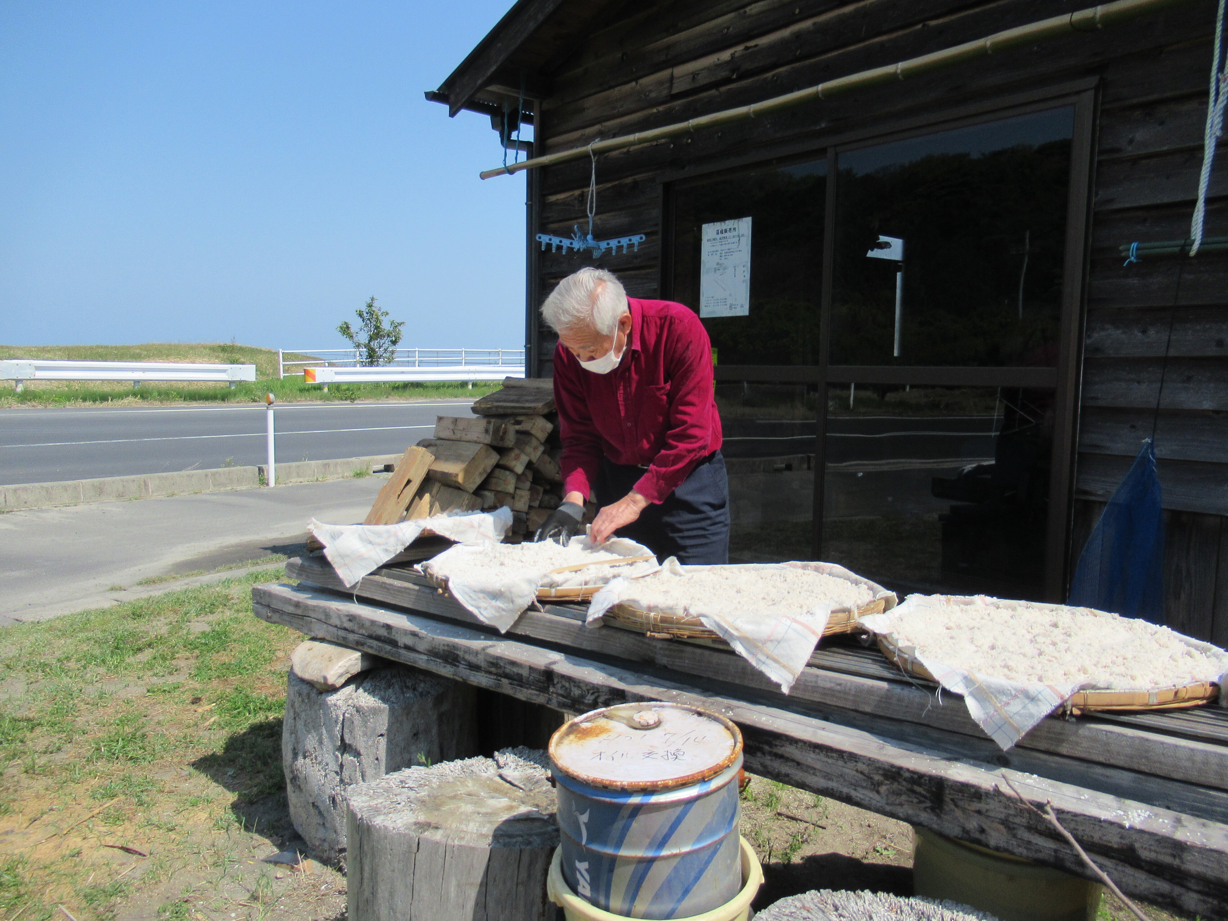 焚きあがった生塩を3日間天日干しします。乾燥してくると固まってしまうので、天日干しの間何度も手でほぐし、ニガリを取り除いて粗塩と選別していきます。その後ストーブで仕上げ乾燥を1日行います。乾燥しにくい6~8月の多湿時期は、作業は中止します。藻塩造りで一番手間のかかる作業です。