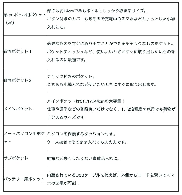 ◎ 傘用、ノートパソコン用、バッテリー用……使い勝手の良い7種のポケット