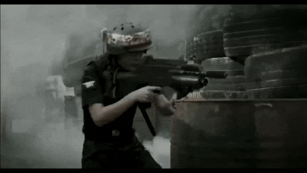 その様子を見ていたARES POWERスタッフは爆笑していましたが、落ち着いて近くのモニターを確認すると銃撃戦の映画が流れていました。