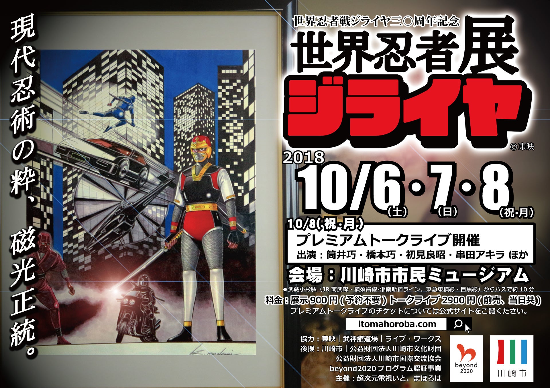 期間は2018年10月6日(土)から8日(祝月)までの三日間。川崎市市民ミュージアム内の企画展示室2に於いて、最終日の8日(祝月)には同会場内の映像ホール(270名収容)にてプレミアムトークライブ。展示会では主人公キャラクターであるジライヤ及び、全てのキャラクターデザインを手がけた村上克司の設定画を中心に、関連資料の展示を行う予定です。