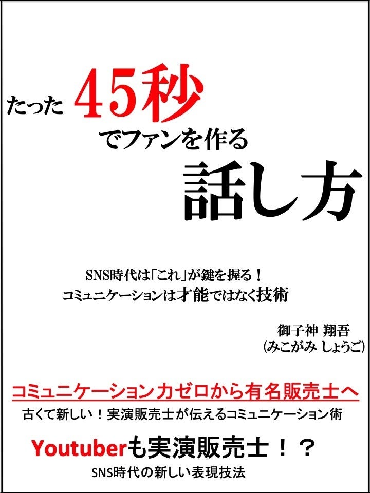「45秒でファンを作る!SNS時代に活かせる話し方(仮称)」。私が実演販売士として10年に渡り重ねた"話し方の研究成果"をあますところなくお伝えします。ざっくりいうと営業・販売・経営・日常生活などで活かしコミュニケーションでの悩みを克服しよう!というスタンスになっています。単なるコミュニケーションスキルだけでなくSNSビジネスの具体的なノウハウにも触れ、現代の社会にも合致した内容としました。