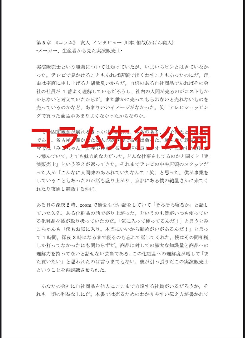 【残り一週間】実際に読んだ人の感想が大切だなと感じていますので、コラム協力いただいた方の原稿を公開します。「第5章 相手からYESをもらう心理テクニック」は生産者(メーカー)の立場から友人である、カバン職人かばんばかにコラムを書いてもらいました!※原稿整理前のため書店に並ぶ際は変更がある可能性があります。友人ならではの視点で面白いコラムになりました。読んだ感想などスクショとともにSNSでシェア頂けると嬉しく、大変励みになります。#全力でエゴサしてます-------------------------------------------------------------------------------------------------------------------第5章 《コラム》 友人 インタビュー 川本 侑哉(かばん職人)-メーカー、生産者から見た実演販売士-実演販売士という職業については知っていたが、いまいちピンとはきていなかった。テレビで見かけることもあれば店頭で出くわすこともあったのにだ。理由は率直に申し上げると胡散臭いからだ。自信のある自社商品であればその会社の社員が1番よく理解しているだろうし、社内の人間が売るのがコストもかからないと考えていたからだ。また誰かに売ってもらわないと売れないものを売っているのかなど、あまりいいイメージがなかった。笑 テレビショッピングで買った商品があまりよくなかったからなのか。その固定観念が崩れるきっかけが訪れた。本著の著者、御子神氏との出会いである。名古屋で開かれた知人の飲み会で彼と出会った。歳も近く意気投合し今では「みこちゃん」と呼ぶ仲だ。彼の人柄の良さ、オープンに話す内容はぶっ飛んでいて、とても魅力的な方だった。どんな仕事をしてるのかと聞くと「実演販売士」という答えが返ってきた。それまでテレビの中や店頭のスタッフだった人が「こんなに人間味のあふれていたなんて!笑」と思った。僕が事業をしていることもあったのか話も盛り上がり、京都にある僕の鞄屋さんに来てくれたり夜通し電話する仲に。ある日の深夜2時、zoomで他愛もない話をしていて「そろそろ寝るか」と話していた矢先、ある化粧品の話で盛り上がった。というのも僕がいつも使っている化粧品を彼が取り扱っていたのだ。「気に入って使ってるんだ!」と言うとみこちゃんも「僕もお気に入り。本当にいいから勧めがいがあるんだ!」と言って1時間。深夜3時になるまで寝るのも忘れて話してくれた。僕はその間相槌しか打ってなかったにも関わらずだ。商品に対しての膨大な知識量と商品への理解力を持ってないと話せない芸当である。この化粧品への理解度が増して「また買いたい」と思われたのは言うまでもない。彼が引っ張りだこの実演販売士ということを再認識させられた。あなたの会社に自社商品を他人にここまで力説する社員がいるだろうか。それも一切の利益なしにだ。本書では売るためのわかりやすい伝え方が書かれていたが、彼の商品への高い理解度と愛が基礎にあってのこだと感じた。例えるなら自分の好きな趣味を楽しそうに、わかりやすく、ルーツから話してくれるのである。一度その説明を受ければ誰でも彼から買いたくなってしまう。