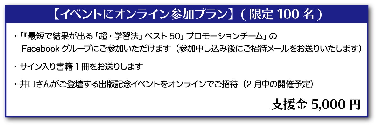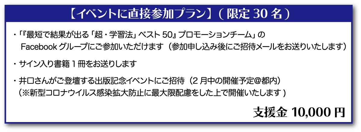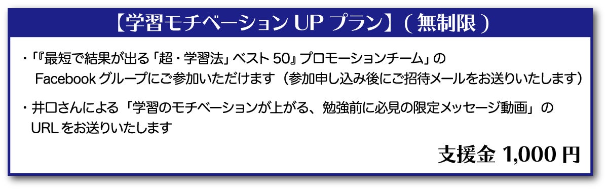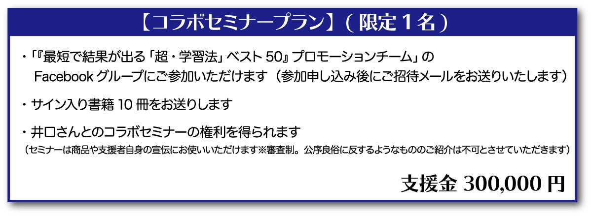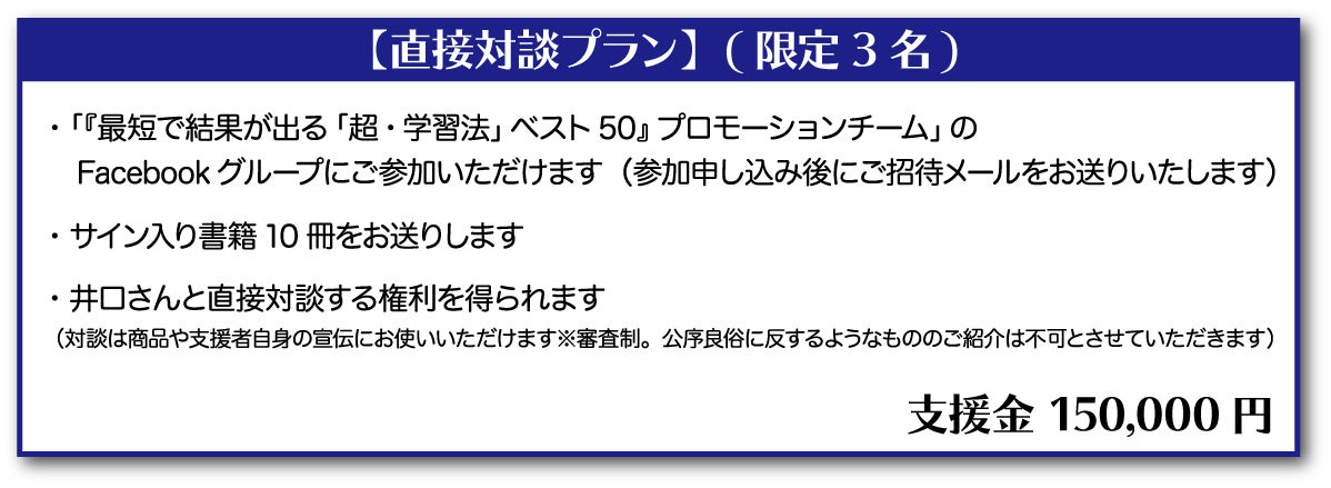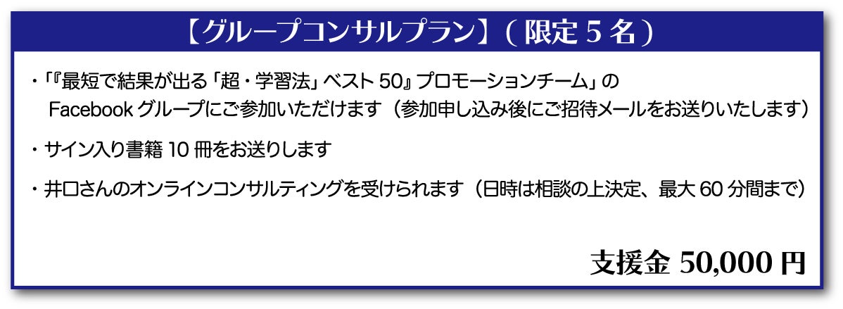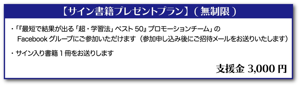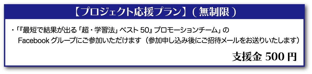 こちらのプロジェクトにご支援いただいた方は、本書を通じた情報発信をするグループ「『最短で結果が出る「超・学習法」ベスト50』プロモーションチーム」への参加資格を得られます。これはFacebookの秘密のグループで、以下のような情報交換、情報共有をおこなっていく予定です。