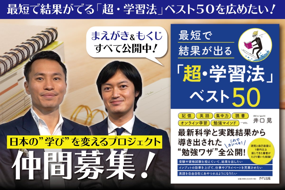 本プロジェクトでは井口晃さんの著書『最短で結果が出る「超・学習法」ベスト50』のプロモーションをおこない、日本中に広めることで、一人でも多くの“日本人の学びを変える”ことを目標としています。