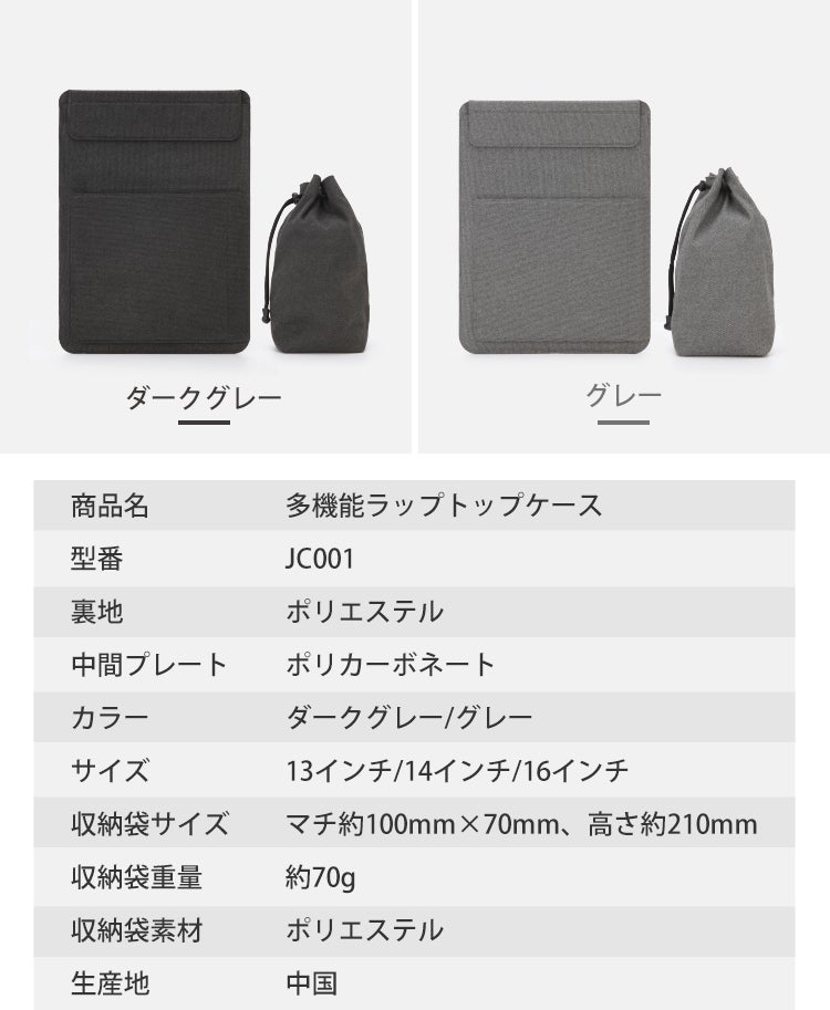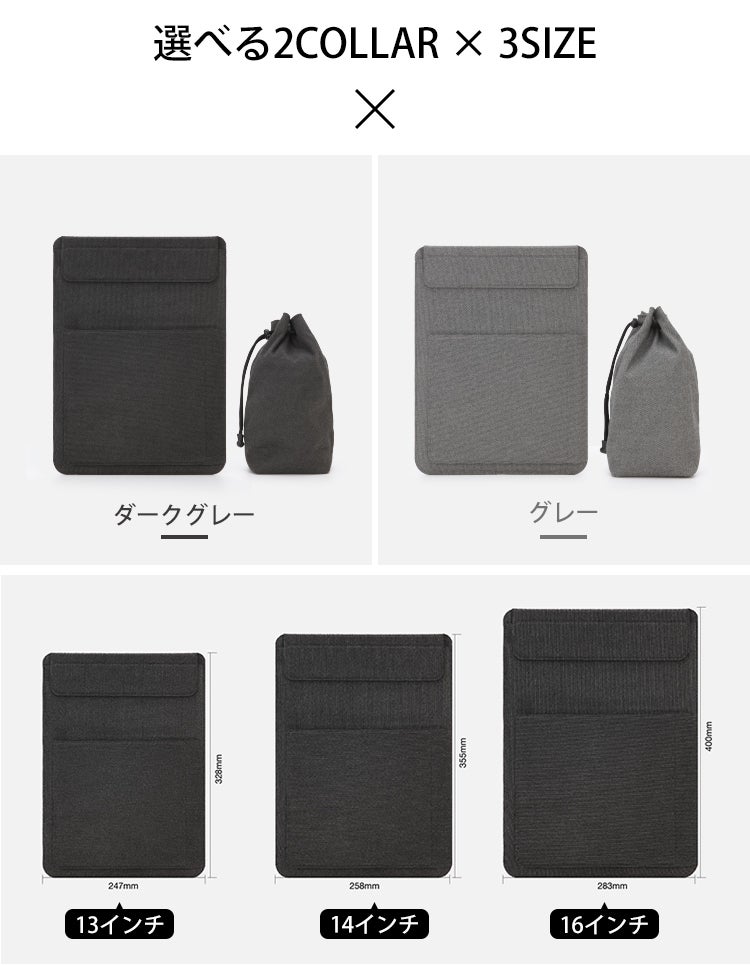 ラップトップケースと同じ色の、マチ約100mm×70mm、高さ約210mmの巾着収納袋を付属!