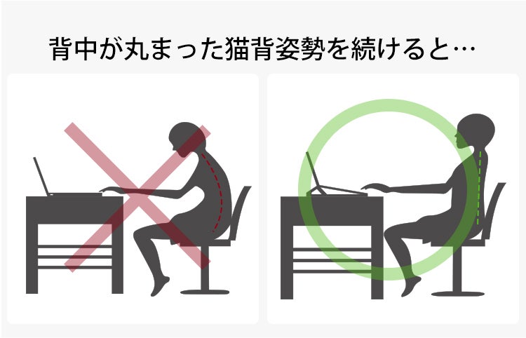 位置が低いノートパソコンでの作業は、前傾姿勢や猫背になりがち。それらの姿勢は疲労感を蓄積し、身体には悪影響ばかり。決して良いことはありません。