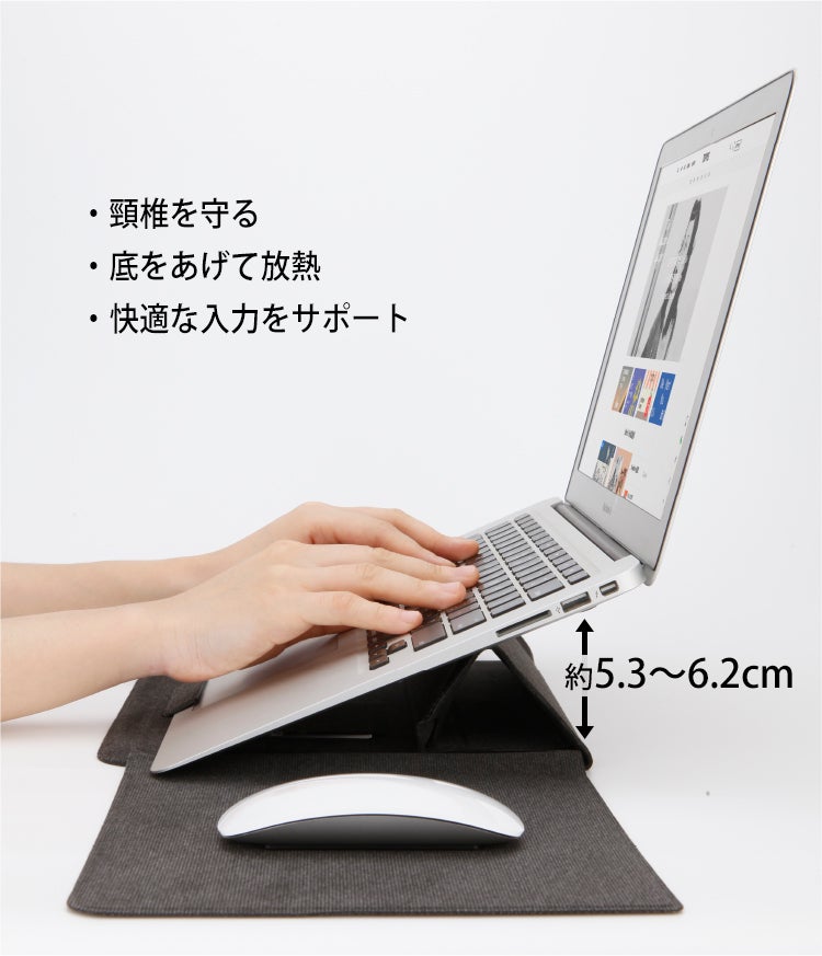 折り畳むだけ簡単組み立てスタンド。約5.3~6.2cm(※サイズによって異なります)の高さを生み出し、ディスプレイ画面の高さをアップ。頭と首を下に向けず前傾姿勢を制御、頸椎を守ります。