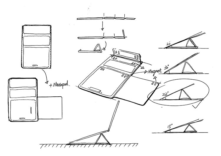 姿勢を正す程よい角度の他にもマウスパッドや収納ポーチも贅沢に。今自分が欲しいものを詰め込みました。簡単にできる組み立て式のスタンドは、忙しい毎日にちょっとした遊び心を思い出させてくれるはずです。