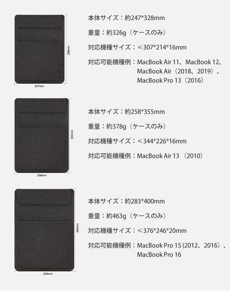 本商品はアスペクト比が16:9のノートパソコンがもっとも収納しやすいサイズ設計になっております。アスペクト比が4:3のノートパソコンの場合、厚さに余裕を持ってサイズをご選択ください。