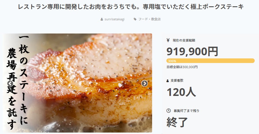 第一弾プロジェクト「レストラン専用に開発したお肉をおうちでも。専用塩でいただく極上ポークステーキ」では、多数のご支援をいただきプロジェクトを成功させることが出来ました。