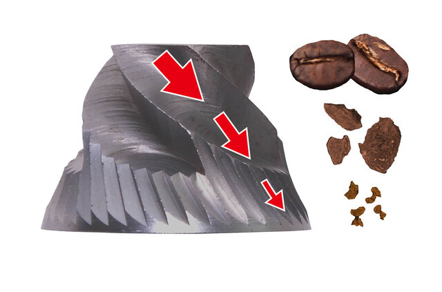 ▼大きな刃と小さな刃を組み合わせることで、コーヒー豆を徐々に小さく「切って」いくので、均一に豆を挽くことができます。