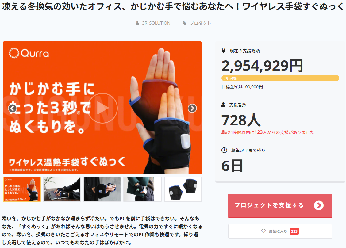 2021/01/26 15:53この度は「すぐぬっく」へご支援いただき誠にありがとうございました。ご支援者様900名を突破して、プロジェクトが終了いたしました。一部のお客様はお手元に製品が届いている方もいらっしゃいますが本日、追加割をご購入されたお客様へも発送が完了いたしました。すぐぬっくが届いた方のTwitter投稿を見ますと大変嬉しい内容もあり、弊社の全社員大変喜んでおります。Yahooリアルタイム検索すぐぬっくが届きましたらぜひ、TwitterやInstagram等でご感想をお聞かせください!また、不具合等ございましたら、メッセージ・お問合せご連絡くださいませ。今後ともスリーアールソリューションを何卒よろしくお願いいたします。 もっと見る本日終了!すぐぬっく