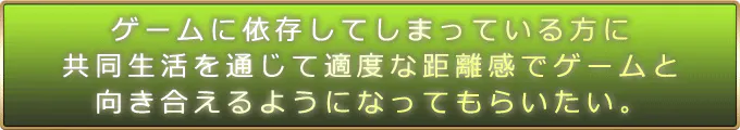 2.ゲームに依存してしまっている方に、共同生活を通じて適度な距離感でゲームと向き合えるようになってもらうこと。