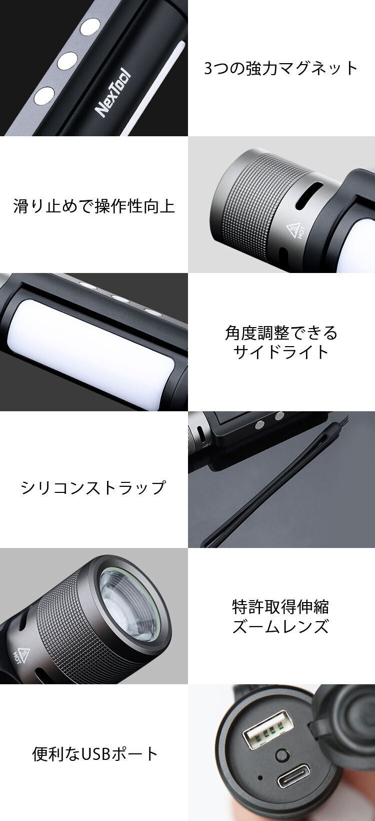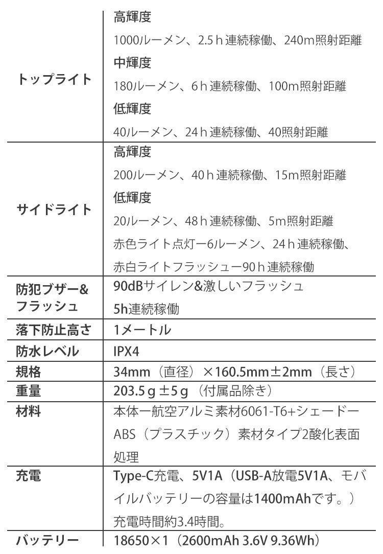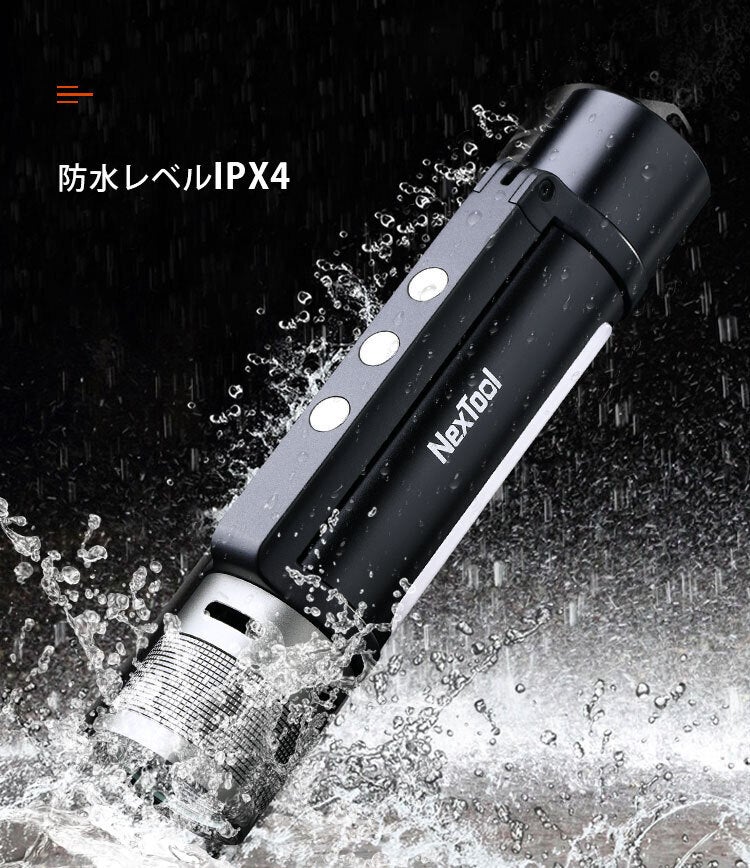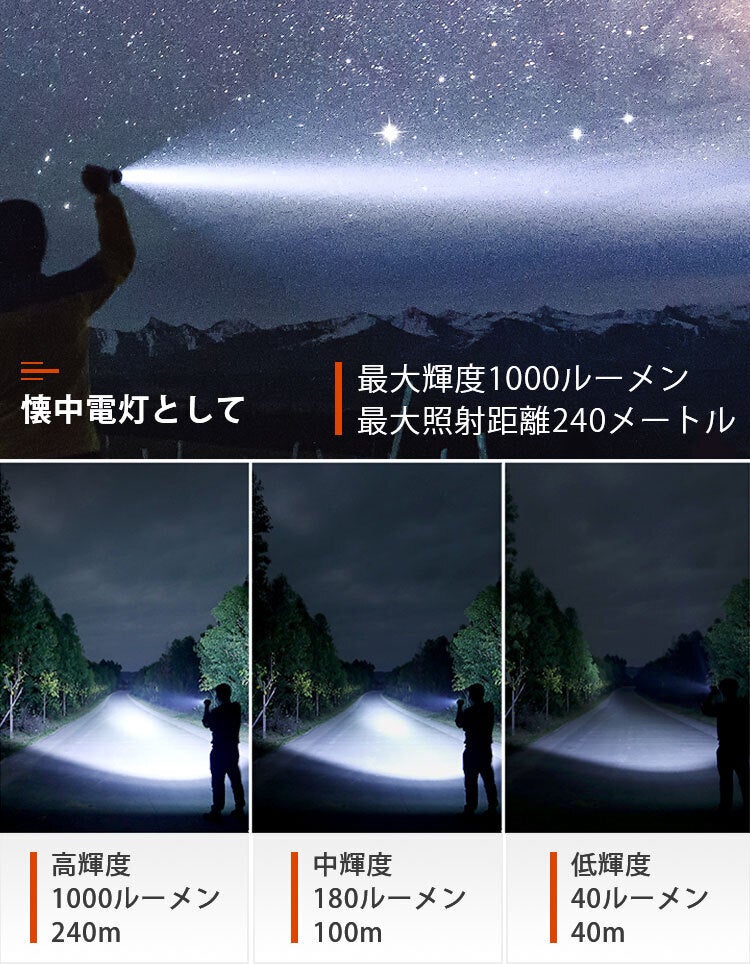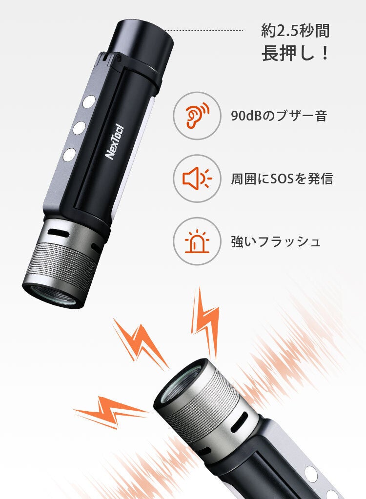 その上、懐中電灯としての機能も劣らず、最大輝度は1000ルーメン。特許を取得した伸縮ズームレンズで、ライトの照射距離・範囲も自由自在!360°回転するサイドライトは、マグネット貼り付け&角度の無段階調整が可能。モバイルバッテリー機能を搭載した「Thunder」は、USB Type-C充電式で繰り返しの使用もOK。