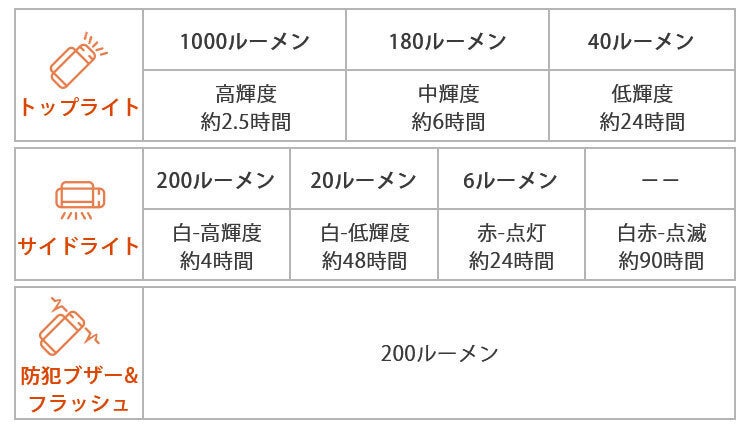 フル充電で使用できる、連続点灯時間は上記のとおり。サイドライトの白光低輝度モードが一番長く、最大48時間(丸2日間!)の連続点灯が可能。災害時でも安心することができます。