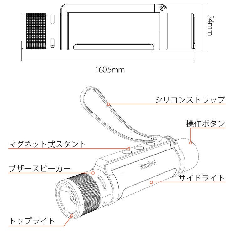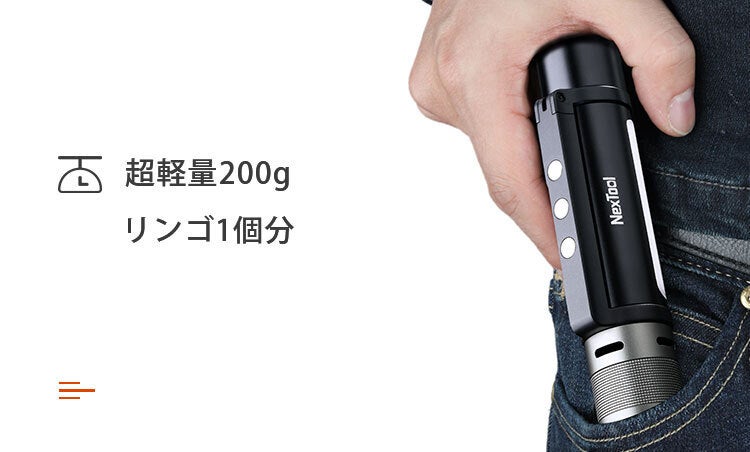 約160.5mm×34mm・重さ203g。懐中電灯として持つにも、バッグに入れて持ち運ぶにも負担にならない、わずかリンゴ1個分ほどの軽量サイズ!