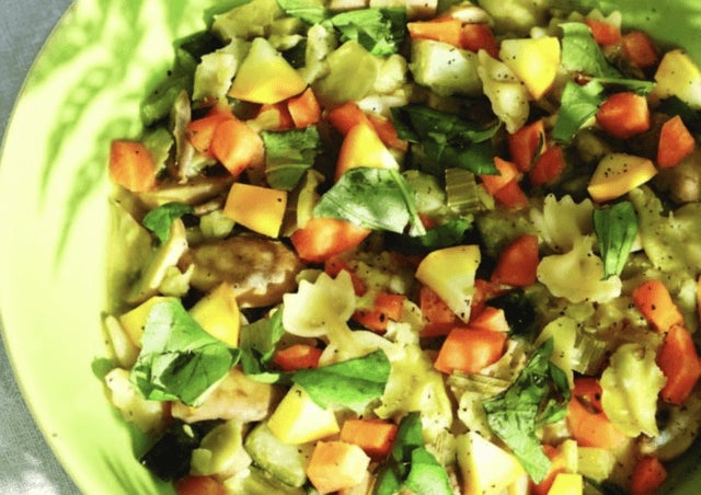 材料:・人参 1本 ・セロリ 1束 ・マッシュルーム 好きなだけ ・ニンニク 2〜3片 ・ローズマリー 小さじ1 ・オリーブオイル 大さじ2 ・塩胡椒 小さじ1 ・唐辛子 適量 ・ズッキーニ 1本 ・そら豆500g ・水 1.3ℓ ・野菜スープの素 大さじ1 ・マカロニ ひとつかみ ・バジル 1束