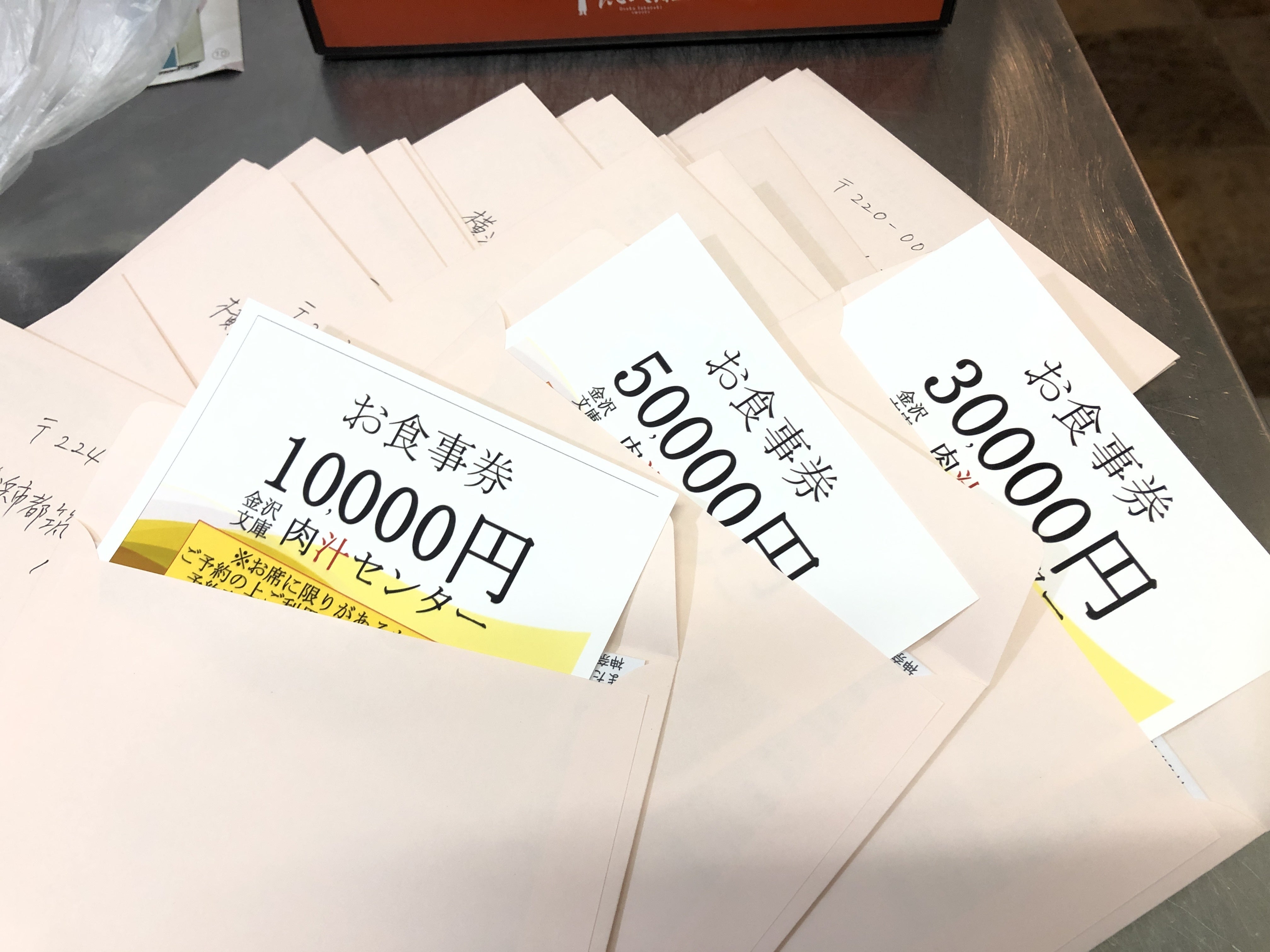 第一弾完了しました!お待たせしています。あなた様にご支援いただいた、[肉汁で横浜から日本を元気にするプロジェクト]リターンのお食事券、第一弾の発送をしました。話題が前後しますが、お食事券の発送より先に牛タンなどお肉の発送も順次進めております。どうでしょう。もう、お手元に届いた方は、いらっしゃいますか?・ゴロっと丸ごと牛タン切り落とし・丸ごと一本特選牛タンなど、お召し上がりになる前に、「食べ方がわからない」「プロならではの調理法を知りたい」など、など。ご要望がありましたら、ぜひメッセージを送ってください。もちろん、お好みで煮込みや、カットして焼肉。サッと塩コショウして焼いただけでもおいしいお肉です。が、ちょっと一手間かけたい場合、下処理の方法、秘密のレシピ、あなた様の笑顔のために喜んで公開いたします^ ^追伸牛タンとお食事券のセットプランのリターンをお求めくださった、あなた!2〜3日中には、すべての仕込みが完了予定です。今週の末にはお届けできると思います。追追伸シャトーブリアン、極上和牛のタン丸ごとプランをご支援くださった、あなた!こちらも準備を進めておりますが、極上和牛タンの入荷が少々時間がかかっています。厳選してお届けいたします。もう少しおまちください。株式会社肉汁開発金沢文庫肉汁センター代表取締役 池田孝行