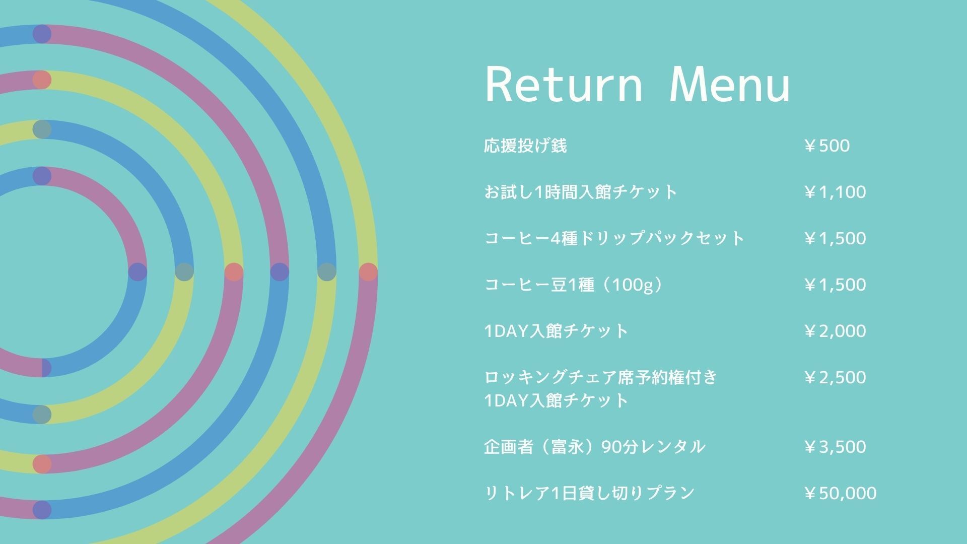 CAMPFIRE限定のお得な価格でお求めいただける入館チケットのほか、レボン快哉湯のコーヒーをはじめとするおうちで"なにもしない贅沢"をお楽しみいただけるセットをご用意いたしました。