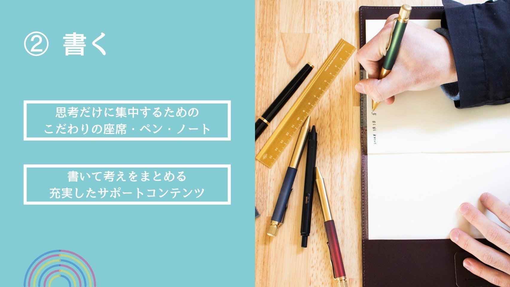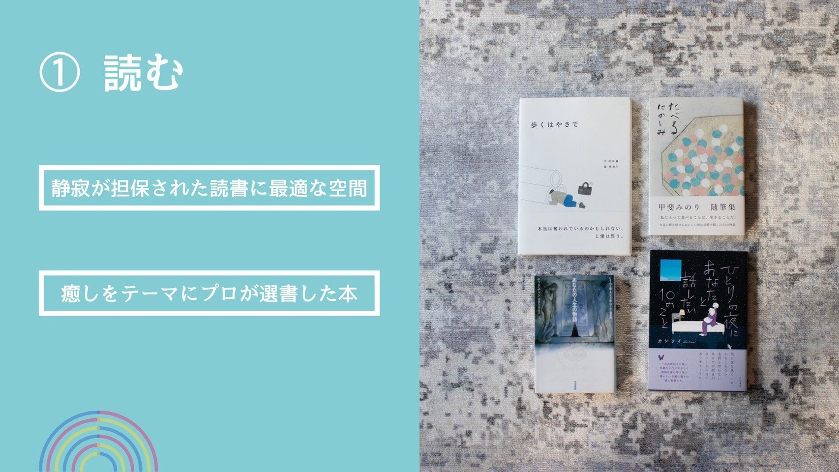 ・瞑想専門アプリ"muon"とのコラボで、6畳一間のお部屋を占有利用して行う、音声ガイダンスによる瞑想のプログラムをご用意しております。"いまここにいる自分"を見つめ、頭をすっきりさせる時間をぜひ体験してください。ハードルが高いように感じる瞑想を、誰でも手軽に体験できる内容となっています。2つの瞑想コンテンツを週替わりで提供しています。