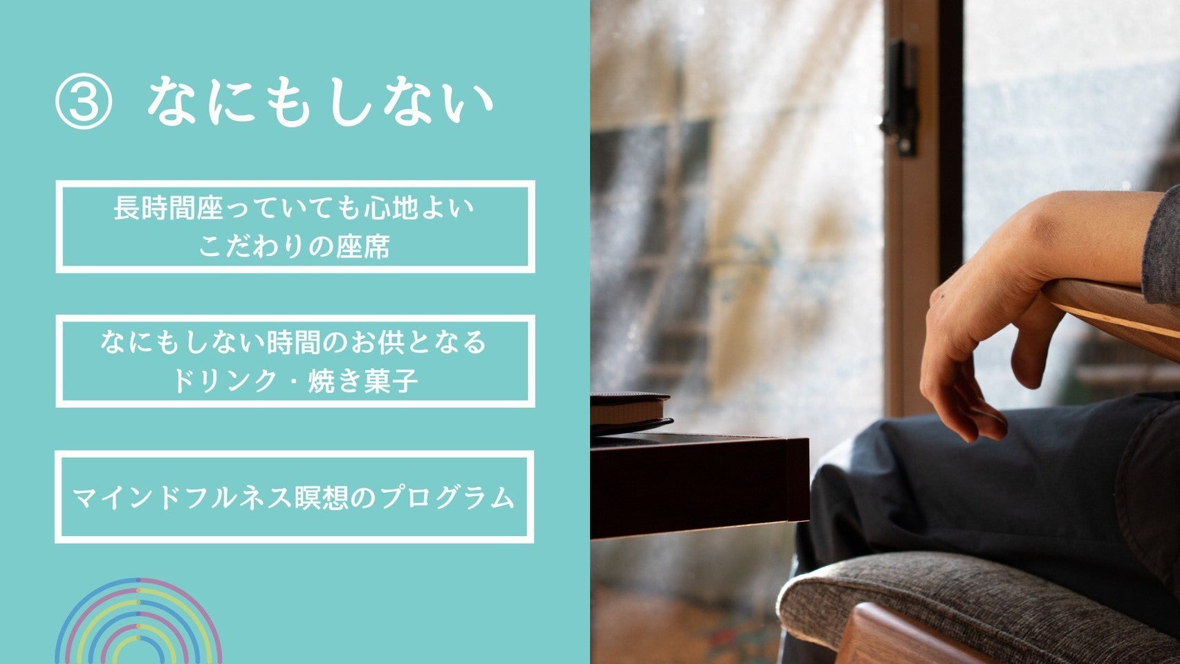 みっつめは「なにもしない」。ただぼんやりとお庭を眺めたり、砂時計の砂が落ちるのを見つめたり、コーヒーやお茶を飲みながら時折ため息をついたり、ただそれだけの時間を過ごすことができます。