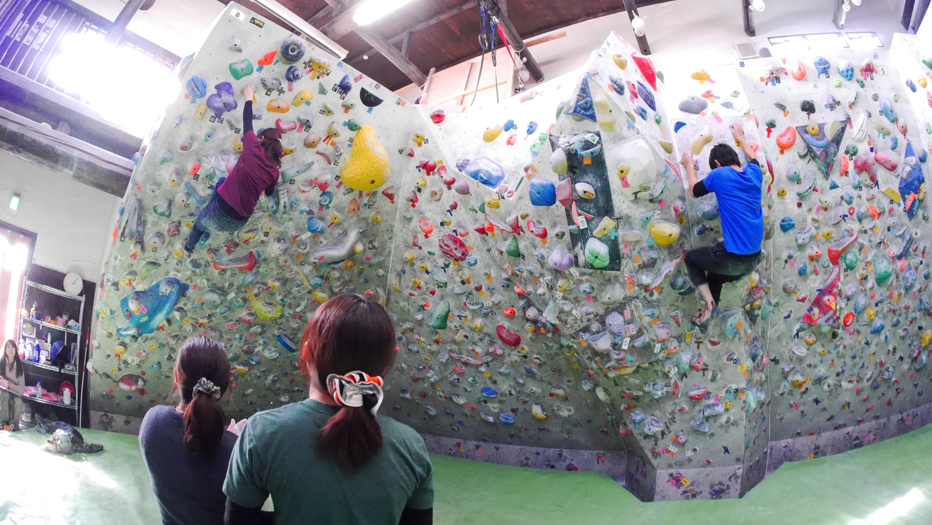 ボルダリングジム風景ボルダリングは、フリークライミングの一つであり、飛び降りれるくらいの岩を命綱無しで登る事を指します。