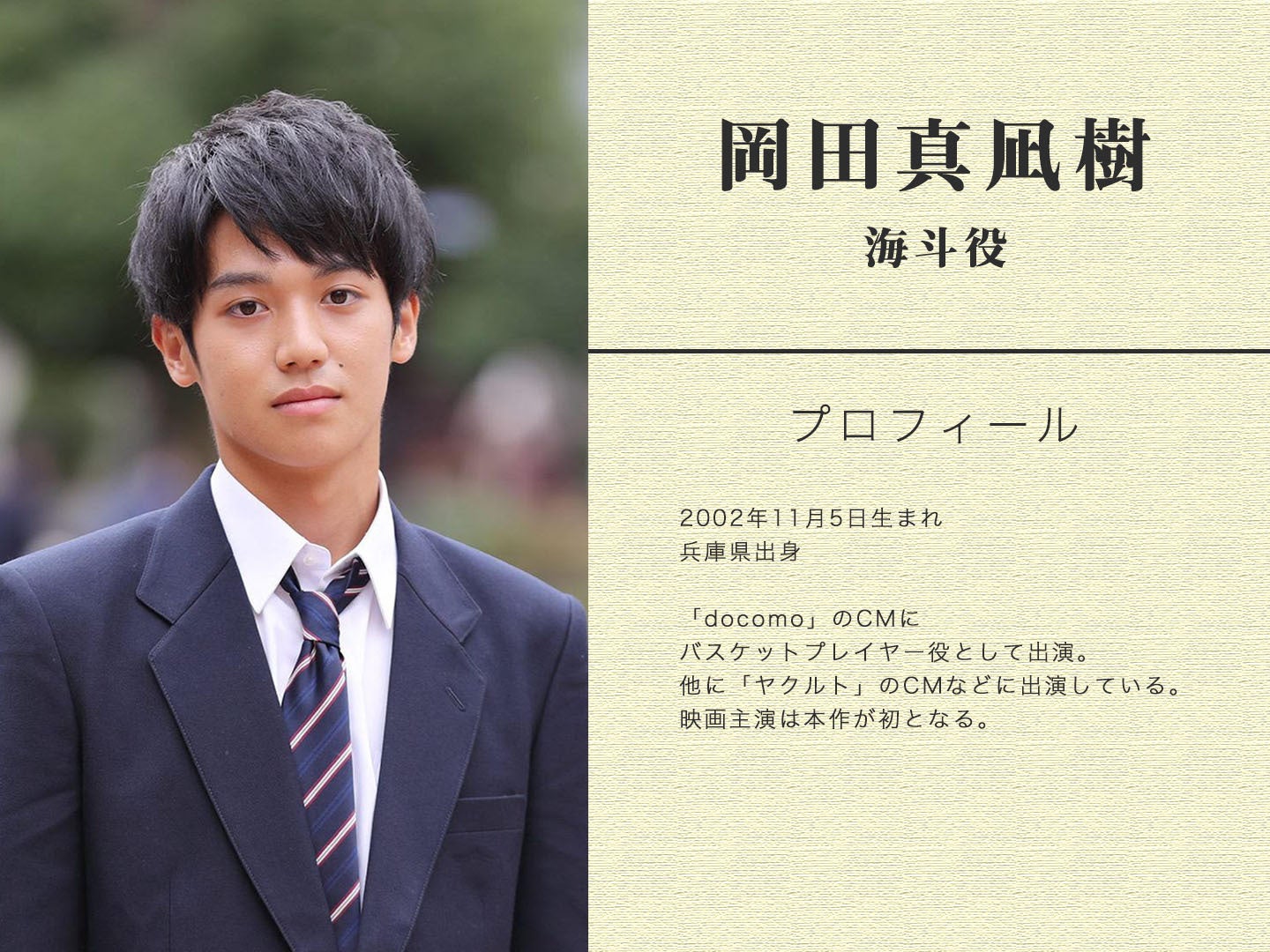 はじめまして今回海斗役をさしていただく岡田真凪樹です。海斗という少年は様々な思いを胸に抱いているの思うので自分にその心情を見ていただく皆様に届けられるようササハラハヤト監督などと一緒に話し合い最高の作品を皆様に届けたいと思っています。