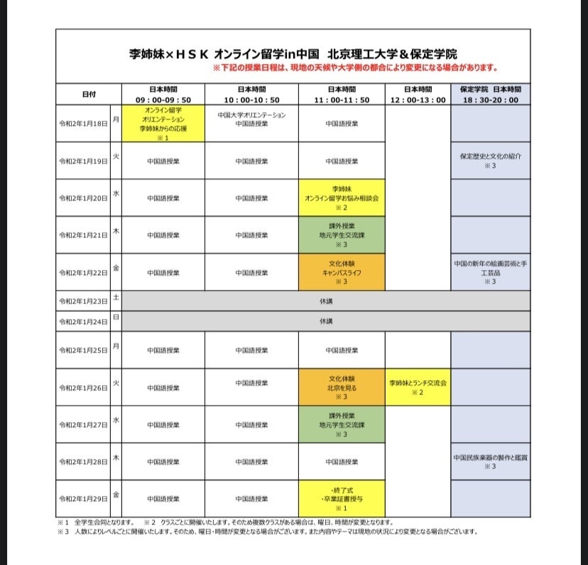 午前中3コマ(日本時間9時~12時)の中国語授業(及び課外講座)